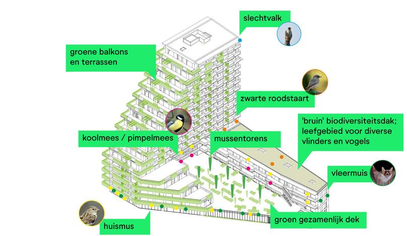 In plaats van groen toe te voegen als afwerking, is biodiversiteit integraal opgenomen in architectuur en detaillering. Verspreid over terrassen, balkons en het collectieve dek zijn circa 600 strekkende meter vaste plantenbakken geïntegreerd in het gebouw. De beplanting is zorgvuldig geselecteerd op basis van zonoriëntatie, hoogte en ecologische waarde. Inheemse soorten zorgen voor een jaarrond voedselaanbod en ondersteunen vogels, bijen, vlinders en andere insecten. Aan en in de gevels zijn 140 nestvoorzieningen opgenomen voor onder andere gierzwaluwen, vleermuizen en verschillende vogelsoorten. Het zogenoemde ‘bruine dak’ versterkt de ecologische continuïteit van de locatie en vergroot de kans op spontane vestiging van inheemse vegetatie.
