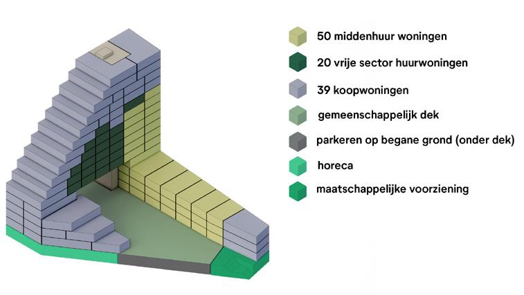 Een sociaal gemengd woonprogramma met gedeelde voorzieningen die ontmoeting stimuleren.