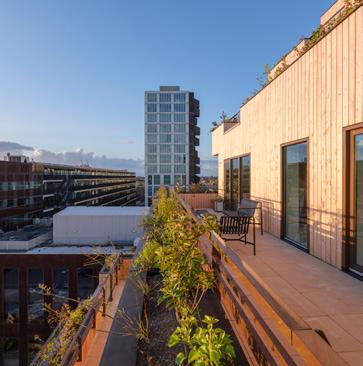 Het groen speelt hierin een verbindende rol: van de buurttuin op maaiveldniveau, via het gemeenschappelijke dek op +1, tot aan de privéterrassen van de woningen. Daarmee ontstaat een continue groene structuur die niet alleen visueel, maar ook ecologisch en sociaal functioneert.