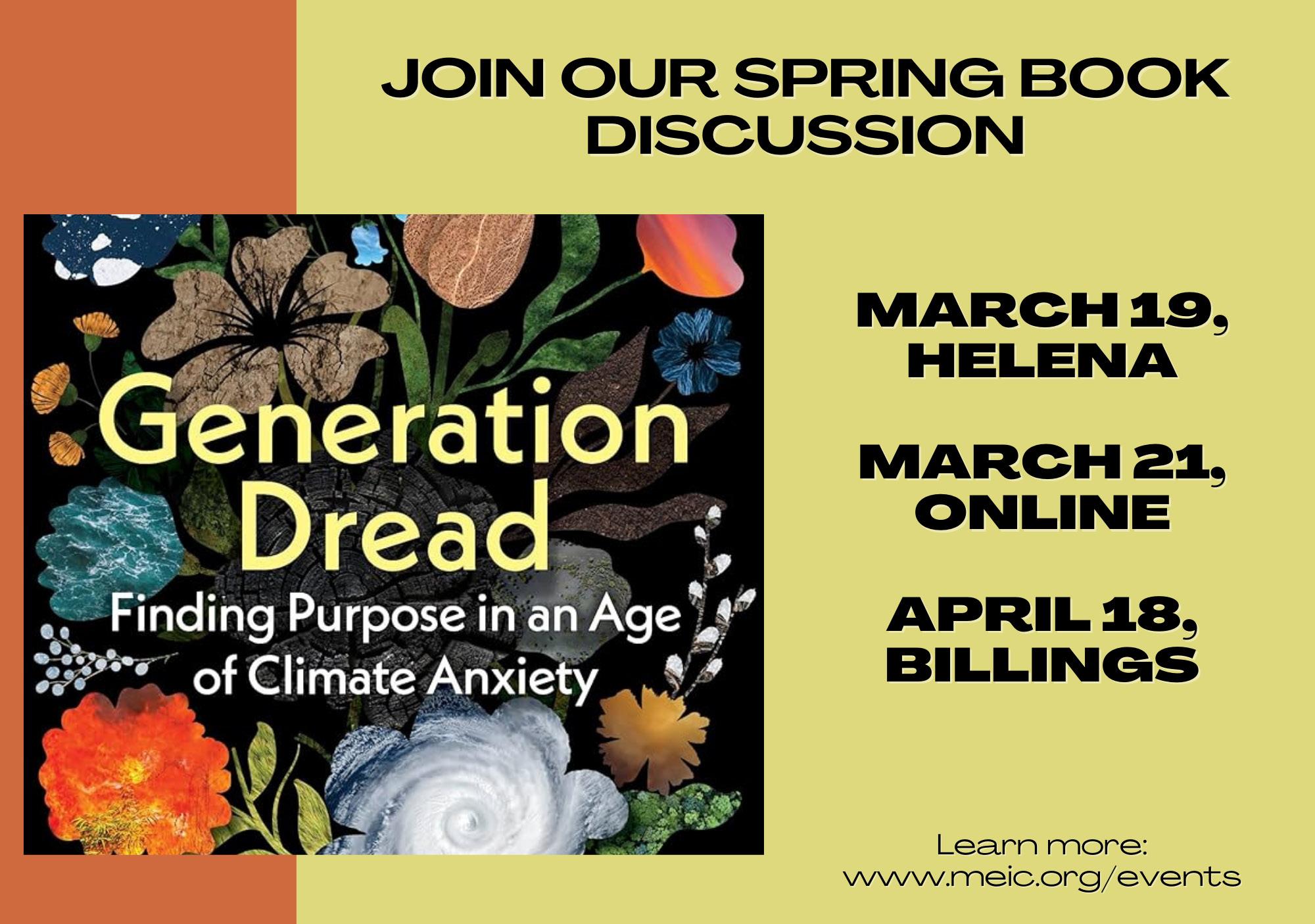 Perhaps you’ve heard about (and plan to join!) MEIC’s Generation Dread book discussion gatherings this spring. I hope that, like me, you’re finding the book to be validating. Author Britt Wray notes that