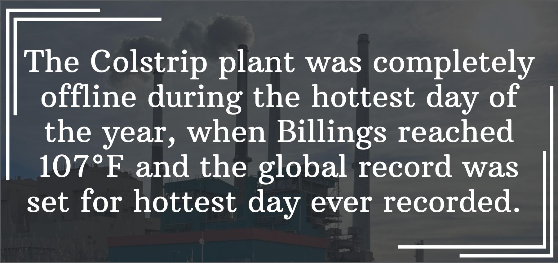 NorthWestern says that wind and solar aren’t reliable enough to provide power for its customers, but the reality is that the Colstrip plant is only 50% reliable when it is most needed. For example, as temperatures plummeted to record levels in early January, one of the two units at the plant had to be taken offline for "maintenance." And during the July heat wave when temperatures across the state had been over 90°F for weeks, half the Colstrip plant went offline on July 18. A few days later, the entire plant went offline. The Colstrip plant was completely offline during the hottest day of the year, when Billings reached 107°F and the