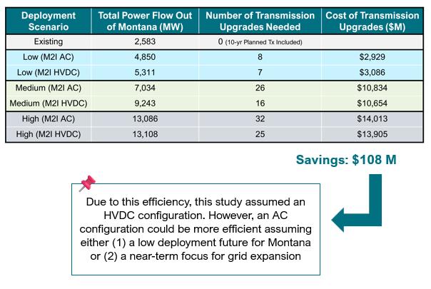 6. Building HVDC early may reduce future upgrade costs. Constructing the Montana–Idaho intertie as HVDC offers flow control benefits that avoid redundant upgrades in higherdeployment scenarios. Results suggest that upfront cost premiums associated with building HVDC are outweighed by long-term efficiency, avoiding $108 million in additional upgrades in the High Deployment case. However, while the study identifies efficiency opportunities with an HVDC configuration of this line, it did not consider all operational, supply chain, or planning complexities and more work is needed in those areas. An AC expansion in this corridor is a viable and beneficial option that may have less near-term risk.