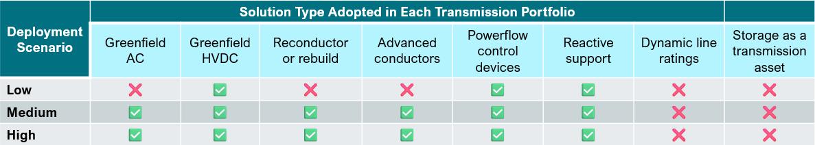 8. A diverse set of transmission technologies improves portfolio efficiency and flexibility: The study found that deploying a mix of transmission technologies enhanced the performance, efficiency, and flexibility of the transmission portfolios. As summarized in Figure 20 below, the transmission solutions adopted in each scenario varied, with higher deployment scenarios leveraging a broader range of technologies to address system needs.