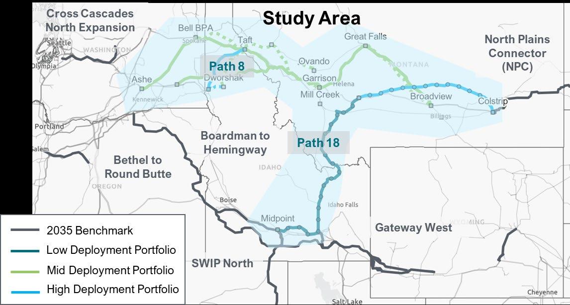 7. The transmission portfolios increase the connectivity of the Western grid: The transmission expansion portfolios identified are strategically aligned with several major projects currently planned or under construction across the West. By linking these new Montana upgrades with recently completed and anticipated projects including Gateway West, Boardman-to-Hemmingway, SWIP North, and North Plains Connector these portfolios strengthen the regional transmission network. The resulting configurations enable Montana resources to access a broader set of markets with the added benefit that Montana can also source electricity from other markets. Collectively, the portfolio investments establish a new high-voltage backbone from North Dakota to Washington, increasing the West’s ability to integrate resources and loads across the region