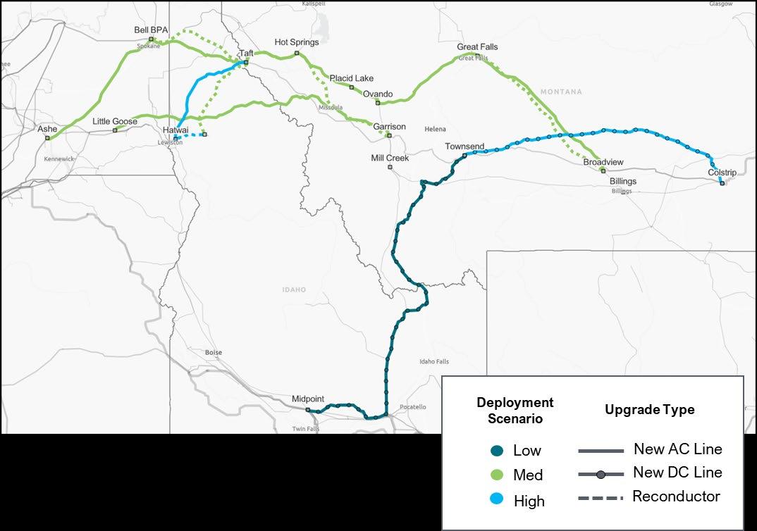 3. A new Montana-Idaho intertie provides a high-impact starting point. For the Low Deployment scenario, a new HVDC line between the Colstrip transmission system and Idaho offers an efficient solution for unlocking a large tranche of interstate connectivity. When paired with minor upgrades in Montana, the portfolio costs roughly $3.1 billion and represents a strategic option to integrate capacity, improve market access, and enhance regional reliability
