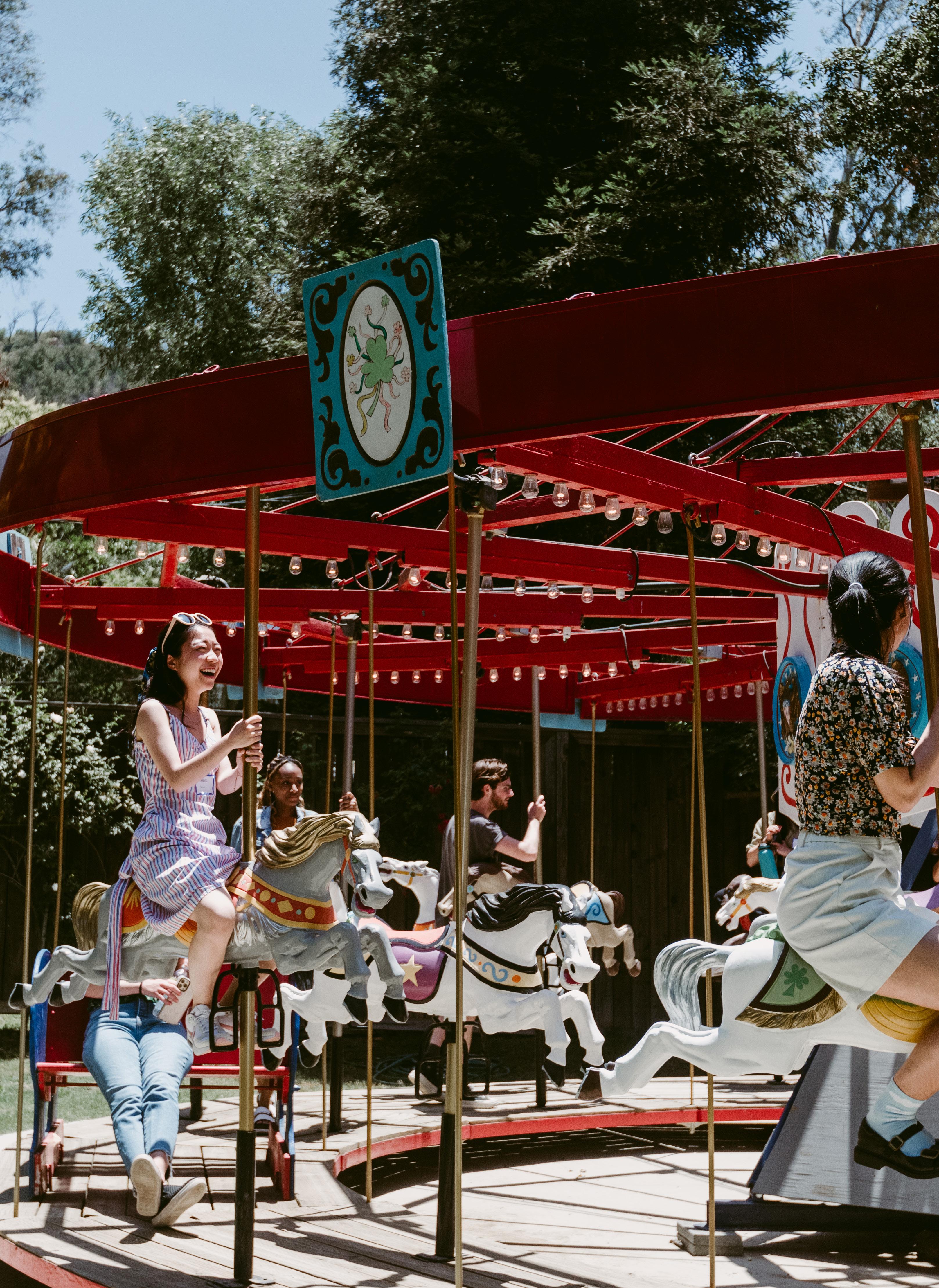 Step into a world where love’s enchantment and nature’s splendor harmoniously blend at the north point of our Malibu Ranch. Your ceremony, set beneath the grandeur of a California oak, resonates with the tranquil sounds of a cascading multi-level waterfall and a serene pond. As the day evolves, guests are welcomed into a stunning reception tent, exquisitely designed to balance luxurious comfort with natural grace. This elegant canvas is artfully set against the whimsical backdrop of our vintage Ferris wheel, creating a picturesque scene that captures the nostalgia of yesteryear and the chic sophistication of modern celebrations.