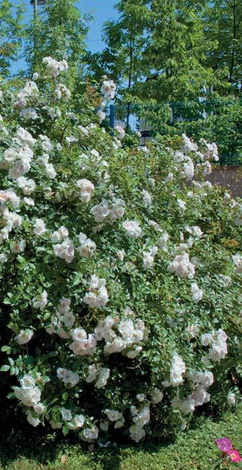 Ce rosier forme de véritables pyramides de petites roses semi-doubles blanc crème.