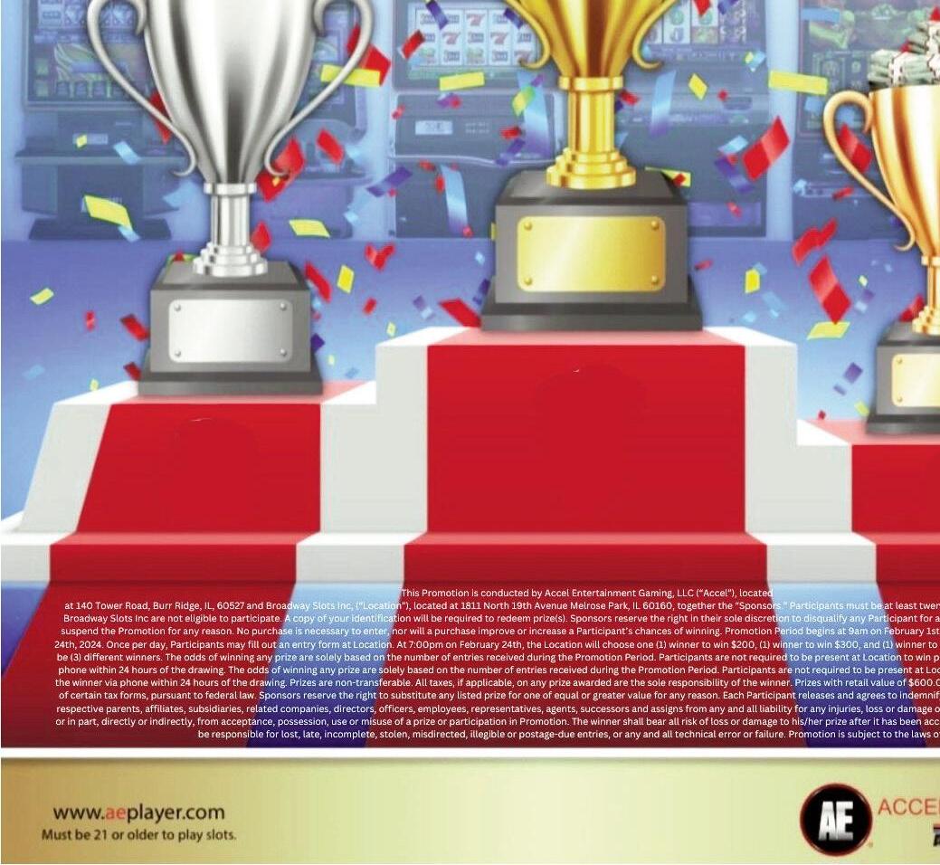 thisPromotionisconductedbyAccelentertainmentGaming,llC(“Accel”),locatedat140towerroad,Burrridge,il,60527,andBroadwayslots,locatedat1811n.19thAvenueinmelrosePark,togetherthe“sponsors.”Participantsin Promotionmustbeatleasttwenty-one(21)yearsofage.employeesofBroadwayslotsarenoteligibletoparticipate.Acopyofyouridentificationwillberequiredinordertoredeemprize(s).sponsorsreservetherightintheirsole discretiontodisqualifyanyParticipantforanyreason,andtoterminate,modifyorsuspendthePromotionatanytimeforanyreason.nopurchaseisnecessarytoenter,norwillapurchaseimproveorincreaseaParticipant’schancesof winning.PromotionPeriodbeginsat11amon10/1/24andendsat7pmon10/31/24.OnceperdayduringPromotionPeriod,Participantsmayfilloutanentryformatlocation.At7pmon10/31/24,locationwillchooseone(1)winnertowin $300,1winnertowin$100and1winnertowin$100.theoddsofwinningaresolelybasedontheamountofentriesreceivedduringthePromotionPeriod.Participantsdonotneedtobepresenttowin.locationwillcontactwinner(s)via phoneinordertoreceiveprize.Prizesarenon-transferable.Alltaxes,ifapplicable,onanyprizeawardedarethesoleresponsibilityofthewinner.sponsorsreservetherighttosubstituteanylistedprizeforoneofequalorgreatervalue foranyreason.eachParticipantreleasesandagreestoindemnifyandholdharmlessthesponsors,theirrespectiveparents,affiliates,subsidiaries,relatedcompanies,directors,officers,employees,representatives,agents,successors andassignsfromanyandallliabilityforanyinjuries,lossordamageofanykindtoParticipantarisinginwholeorinpart,directlyorindirectly,fromacceptance,possession,useormisuseofaprizeorparticipationinPromotion. thewinnershallbearallriskoflossordamagetohis/herprizeafterithasbeenacceptedand/ordelivered.sponsorwillnotberesponsibleforlost,late,incomplete,stolen,misdirected,illegibleorpostage-dueentries; oranyandalltechnicalerrororfailure.Promotionissubjecttothelawsofillinois.