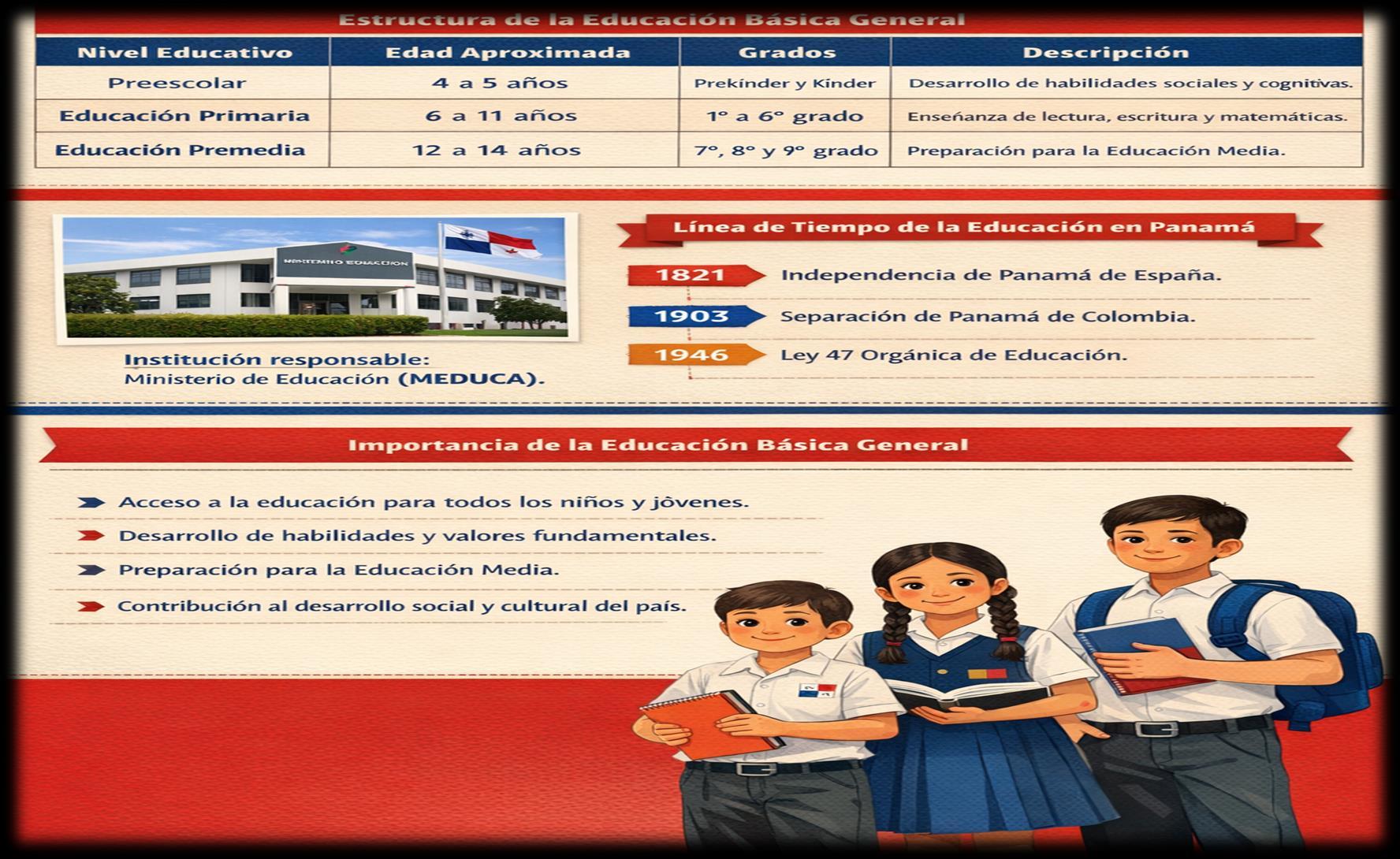 La Educación Básica General representa una etapa fundamental dentro del sistema educativo panameño, pues comprende los primeros niveles de formación académica de los estudiantes y busca desarrollar conocimientos, habilidades, valores y actitudes necesarias para la vida en sociedad.