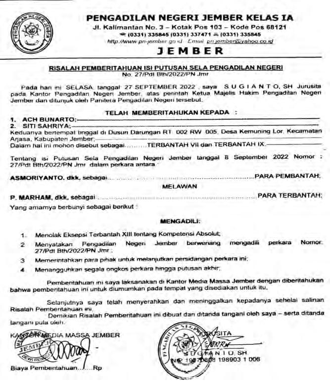 PENGUMUMAN PERTAMA LELANG EKSEKUSI HAK TANGGUNGAN SESUAI DENGAN PASAL 6 UNDANG-UNDANG HAK TANGGUNGAN PT FAJAR BARU GEMILANG OBJEK LELANG Nilai Limit : Rp.6.200.000.000,Uang Jaminan : Rp.1.600.000.000,Syarat-Syarat Lelang: as is Closed Bidding Virtual Account (VA) Hari : Rabu; Tanggal : 26 Oktober 2022; Batas Akhir Penawaran : pukul 10.35 Waktu Server (sesuai WIB); Alamat Domain : www.lelang.go.id Tempat Lelang : KPKNL Surabaya Jl. Indrapura No. 5 Surabaya Penetapan Pemenang : Setelah Batas Akhir Penawaran email PT BPR LESTARI BALI ttd Made Tutik Sri Andayani Petugas mengevakuasi truk terguling bermuatan potongan kayu. Tak Kuat Tanjakan, Truk Muat Kayu Terguling Suasana sidang dugaan pemalsuan dokumen di PN Sidoarjo. Sidang Dugaan Pemalsuan Surat di PN Sidoarjo Lucu, Terdakwa Ngaku Tidak Bisa Membaca dan Menulis Sidoarjo, Memorandum Sidang pidana pemalsuan dokumen tanah seluas 12 hektare kembali digelar di Pengadilan Negeri Sidoarjo, Senin (26/9). Agenda sidang ini untuk mendengarkan keterangan terdakwa Rido Lelono. Kuasa hukum pelapor H Abdul Malik SH. FOTO: MEMORANDUM/KRI FOTO: MEMORANDUM/BWO Rido Lelono menandatangani surat panggilan sebagai terdakwa yang dikirim oleh Kejari Sidoarjo.