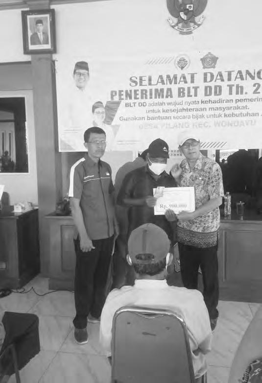 Santunan bersumber anggaran dana desa kepada 114 keluarga penerima manfaat (KPM) terdampak pandemi coviditu berupa bantuan langsung tunai dana desa (BLT–DD).