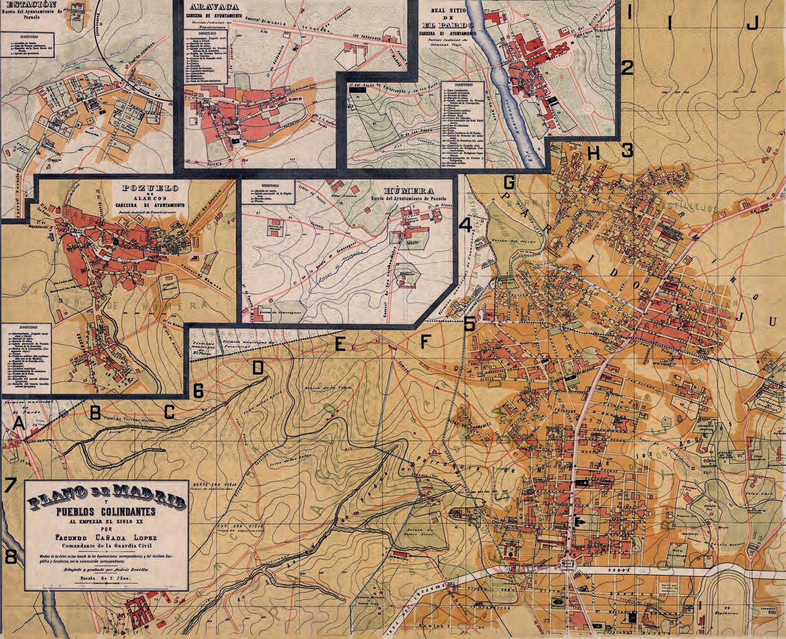 Entra el siglo XX y la época de los grandes planos va llegando a su final. Madrid avanza más allá de sus construcciones. El ámbito cartografiado en los planos crece y el objetivo perseguido cambia gradualmente. La utilidad se desplaza de los planos a los planes. Como primera medida amplían el foco para incluir pueblos vecinos (Cañada, 1900) o se extienden a todo el término municipal (Núñez Granés, 1911). Pese