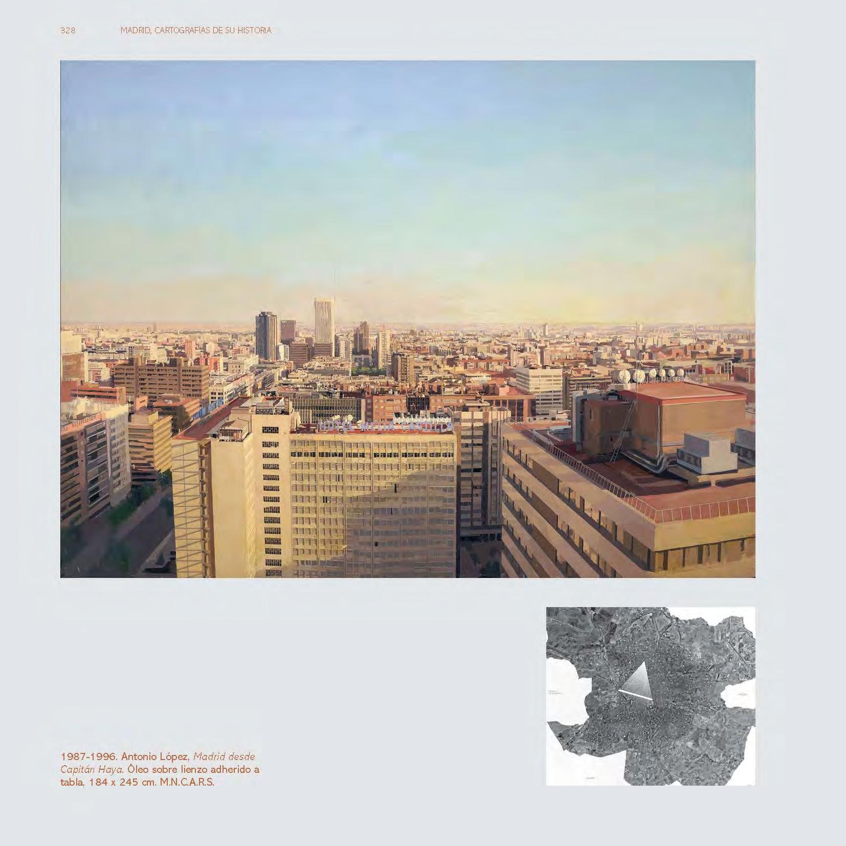 En no mucho tiempo y con la interrupción de la Guerra Civil, el Ayuntamiento (1930-1945) amplió el tamaño y el detalle para añadir y mostrar a escala 1/500 el parcelario y la edificación en un estupendo “plano” en color desagregado en 119 hojas de las que el libro reproduce las nueve correspondientes al Madrid histórico. Unidas darían lugar a un documento inmenso [12 x 15,4 m], difícil, por no decir imposible, de abarcar con una sola mirada. Solución: un Plano de la Villa (1945), de toda la ciudad a menor escala y con menos contenidos, manejable. Al crecer la ciudad, el término municipal se quedó pequeño. Empezando con Chamartín de la Rosa en 1948 y terminando con Villaverde en 1954, Madrid anexionó 13 municipios vecinos y aumentó extraordinariamente su superficie. Las 119 hojas del plano 1/500 dieron paso a las 1.462 del nuevo. La restitución cartográfica a partir de foto aérea lo hizo posible. Un no-plano que al ampliar la escala gráfica atomiza el conjunto. Su reducción en 1970 a la mucho menor escala de 1/10.000 no deja de ser un plano grande: 3 x 8 metros con el que trabajar por hojas, como las cuatro del centro histórico reproducidas en el libro. En paralelo y por lo mismo, las tradicionales vistas de la ciudad pierden importancia frente a vistas parciales que, desde un punto de vista elevado –un cerro o una azotea– como es el caso de los soberbios cuadros de gran tamaño de Antonio López, dan cuenta panorámica detallada de fragmentos del paisaje construido madrileño. Con ellos concluye el libro. Escribí una vez: “si quieres conocer a alguien mírale a los ojos; si quieres conocer una ciudad mira a su centro histórico”. Cuando los planos crecen y crecen, los autores eligen de entre sus muchas hojas las que corresponden al Madrid histórico. Permiten comparar a lo largo del tiempo, pero el concentrar la atención en el Madrid primero extiende sobre el conjunto un ligero tono de nostalgia histórica.