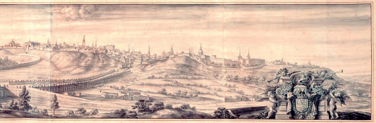 Como complemento de la imagen anterior, al cabo de casi tres décadas Anton van den Wingaerde (ca. 1514-1571), el ilustrador de batallas y ciudades contratado por Felipe II para representar un conjunto de ciudades españolas, realizó esta vista de Madrid desde poniente, inaugurando una imagen preferente de la ciudad que, como se verá, será constantemente actualizada a lo largo de los siglos. Los dos dibujos, a línea y acuarelado, ilustran el proceso de realización, basado en un conjunto de apuntes integrado, que simulan una imagen aérea imposible de realizar como toma del natural desde un punto de vista concreto. En términos de la época esta pretensión de imagen global se denominaba “Corografía”. En este sentido, es interesante contemplar al tiempo la doble imagen, detectándose los ajustes del proceso gráfico, así como algunas contradicciones. En cuanto al primer aspecto, destaca el esfuerzo de realzar la imagen cerrada y completa de la muralla de Madrid mediante un sombreado, insinuando en cierta manera una aproximación a la planta del conjunto urbano. Para valorar lo que es un dibujo como interpretación de la realidad y ser cautos en las afirmaciones, observemos tan sólo el número de ojos del antiguo puente de Segovia, en el que se representan trece arcos en el dibujo de línea y nueve en el acuarelado.