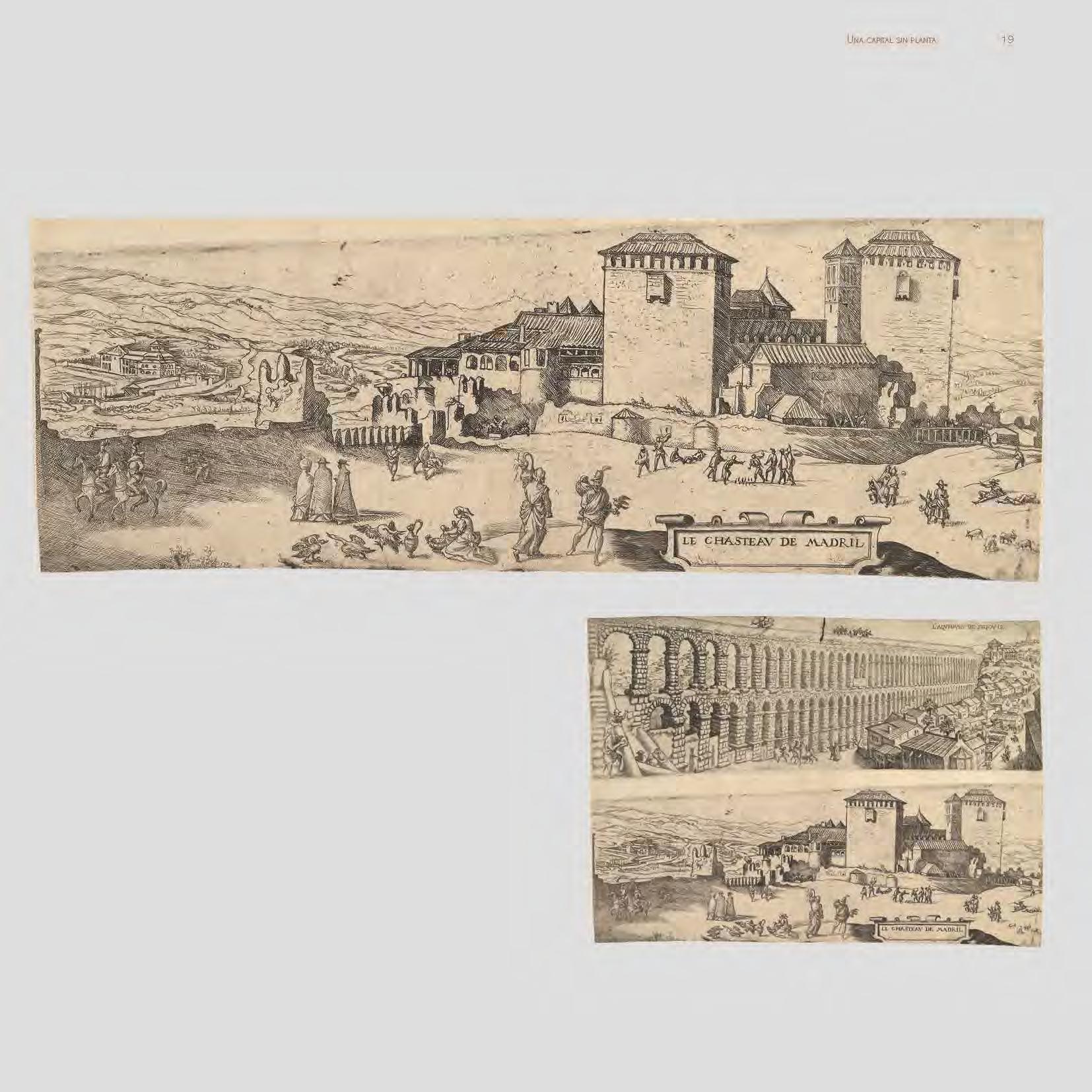 El libro es un relato gráfico. Lo abrimos y, siendo algo injustos con la profusión de otros planos e imágenes, lo recorremos deteniéndonos tan solo en los hitos más significativos. En su comienzo, antes de ser capital, Madrid apenas interesaba. Por eso la primera imagen que vemos es un dibujo mínimo de tiempos de Carlos I [apenas la mitad de un folio de 35 x 49 cm], no de Madrid sino de su modesto primer Alcázar y al fondo la Casa de Vargas. Es casi una postal presentada en pie de igualdad y debajo de una vista del Acueducto de Segovia. Le siguen, ya en tiempos de Felipe II y tras ser Madrid declarada Corte, unas primeras vistas panorámicas desde el oeste mostrando los edificios de la corona y el contorno amurallado al sur y al oeste de la ciudad. Con Carlos I y Felipe II, ningún plano de la ciudad: un vacío cartográfico.