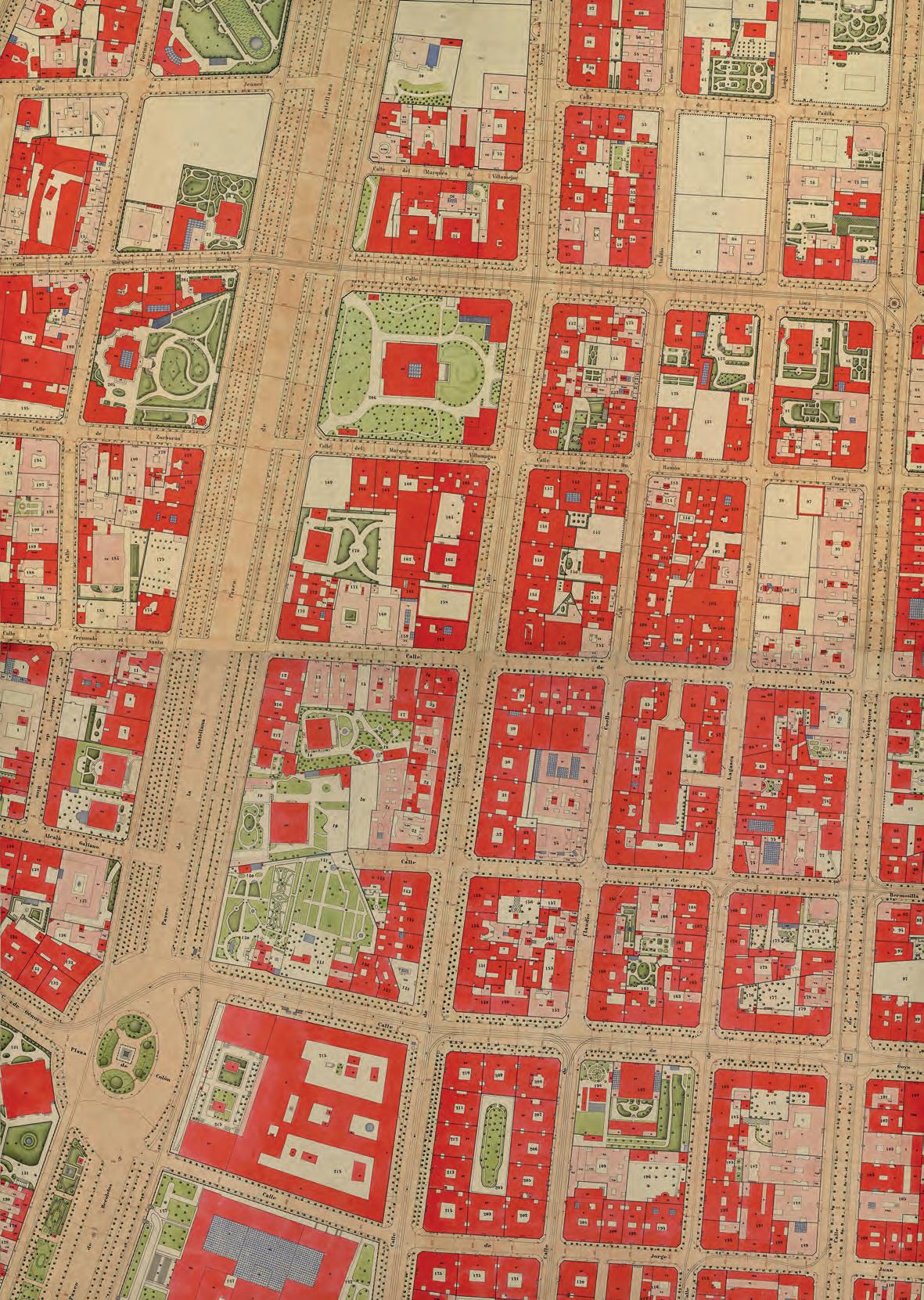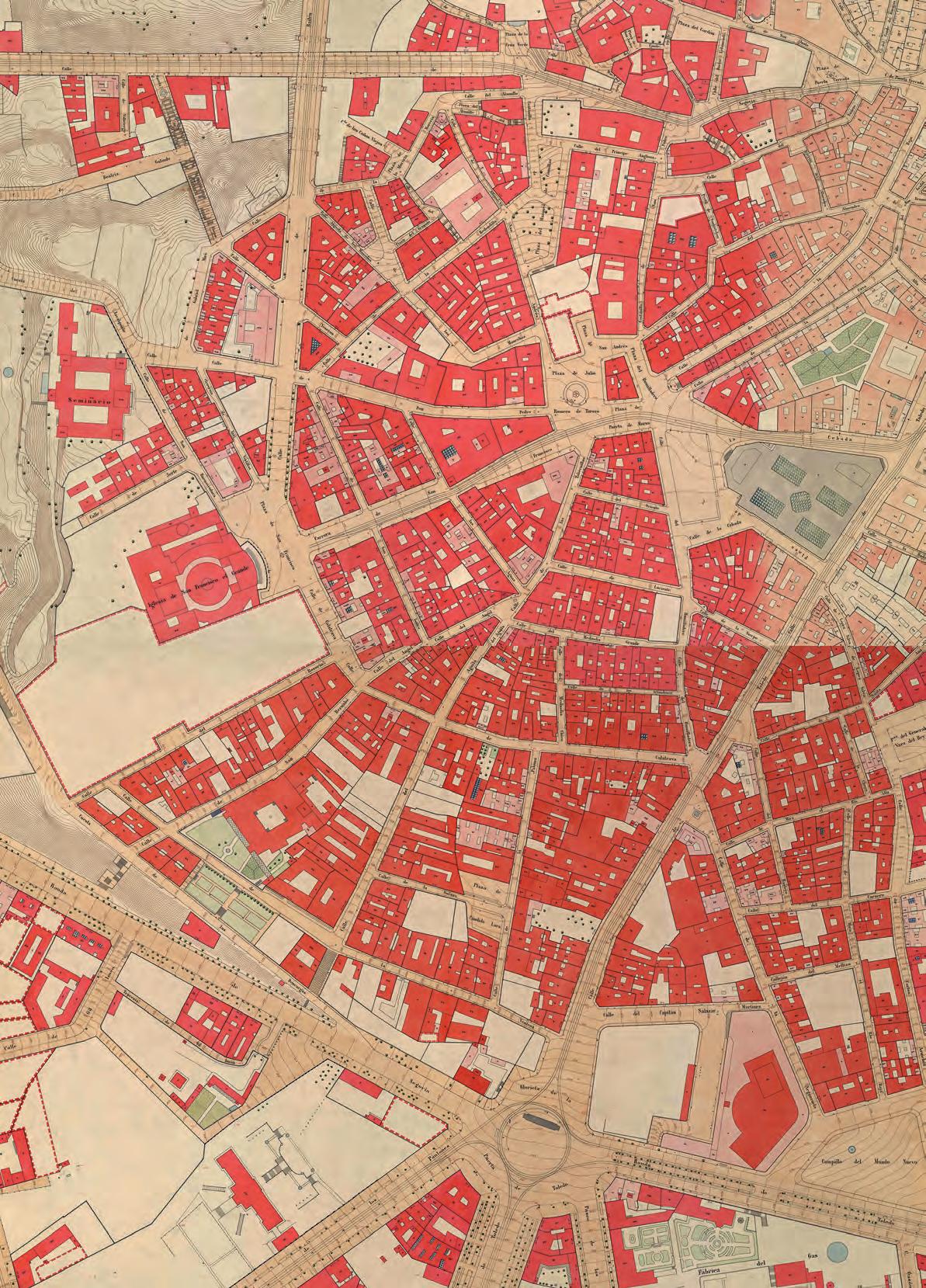 En los planos anteriores, la ciudad aparecía encorsetada por la cerca implantada en 1625 por Felipe IV, pero, como crecía hacia dentro sobre sí misma y sobre terrenos procedentes de derribos y de la amortización de conventos, le estallaban las costuras. El Plan Castro se la saltó (derribada en 1868). Coherente con su plano base (el de Francisco Coello a escala 1/5.000, sobre topografía cuatro veces mayor a escala 1/1.250), Castro rehúye toda figuración: manzanas sólidas sin detalle interior, edificios públicos destacados en silueta (como en el plano de Espinosa de los Monteros) y, de nuevo, extremo detalle en jardines y parques. Aunque no es este lugar ni momento de comentar el Plan Castro, no me resisto a destacar un rasgo que denota lo que este plano de anteproyecto tiene a la vez de pragmatismo y ensueño: el Plan desborda la cerca, pero el ensueño desborda el Plan al sugerir, casi como un after thought a juzgar por el dibujo, que la ciudad crecería o podría crecer al norte mediante una retícula prolongable de manzanas regulares. El ensueño estuvo en el dibujo de esas manzanas; en el plano oficial desaparecieron. Las vistas y dibujos que en el libro lo acompañan no son vistas tradicionales. Son vistas aéreas de la ciudad: constructos mentales, dibujos teóricos, innovación y sorpresa que la profusión y familiaridad con las fotografías aéreas han diluido. En contraste con lo que de futuro tenía el plan Castro, el siguiente hito en el relato cartográfico sería el Plano Parcelario de Madrid que dirigió Carlos Ibáñez Ibero, 1872-1874, publicado poco después. Este plano aterriza en su presente topográfico, geométrico e inmobiliario madrileño con la misma intención e iguales contenidos del ya comentado plano de Espinosa de los Monteros. Subdividido en 16 hojas, sintetiza un sinnúmero de levantamientos previos escala 1/500 dando lugar a un formidable plano instrumental que sirve para todo: obras, finanzas..., lo que haga falta. “Sirve” es la palabra clave. Aun siendo síntesis, es un plano sumamente detallado que invita a estudiarlo detenidamente. En él están los perímetros y patios de todos los edificios, la planta interior de los principales, el detalle de los paseos y jardines, los nombres de los sitios y las calles, los números de las casas. Precisión es el nombre del juego y que cada uno lo utilice como y para lo que le convenga. El libro reproduce sus 16 hojas. Una de las dos vistas que lo acompañan, la Vista general de Madrid realizada por Deroy, transmite el mismo impulso de precisión analítica. Con ese plano, la cartografía deja de ser trabajo de encargo y pasa a ser un servicio público a cargo de una nueva institución, el Instituto Geográfico y Estadístico: un paso al frente.