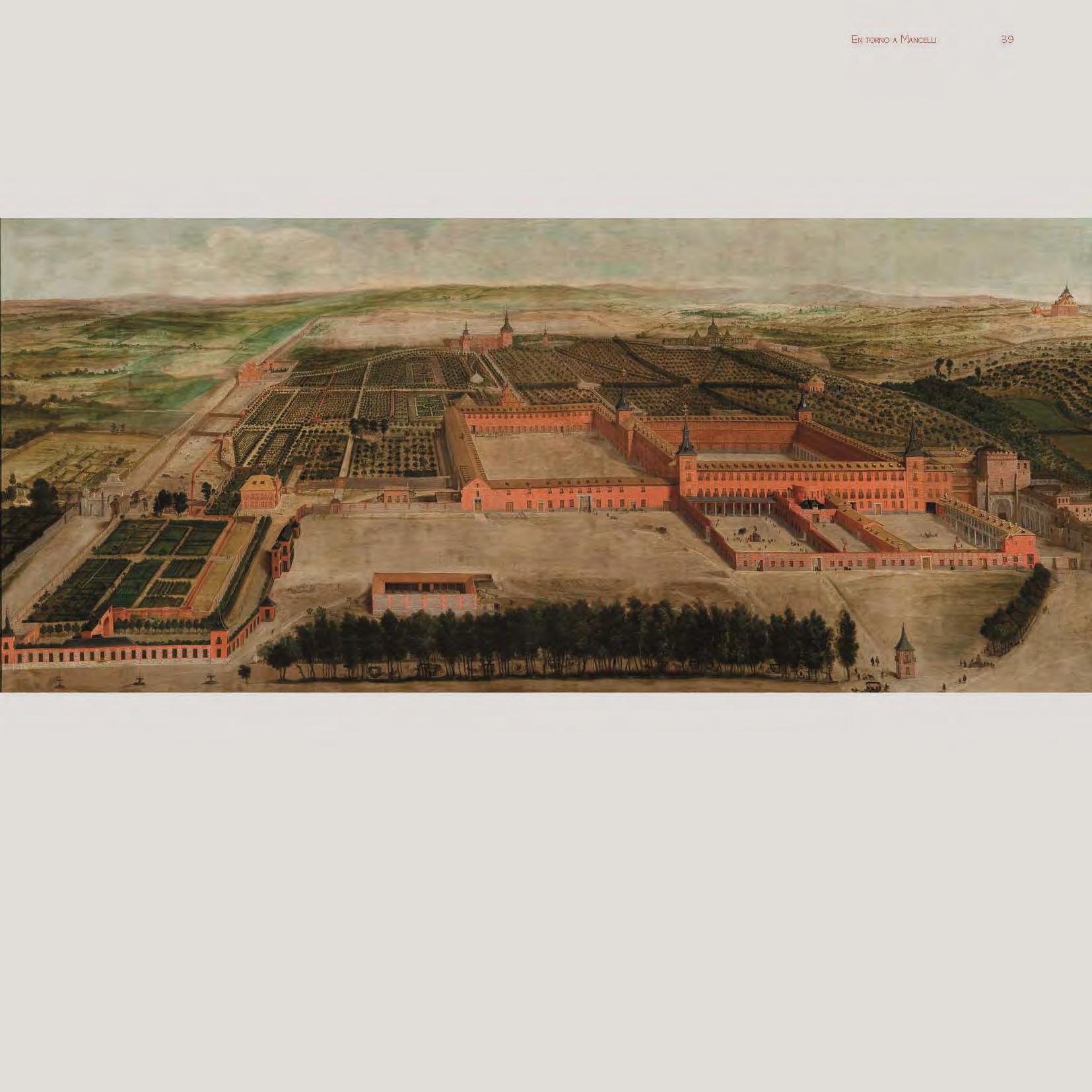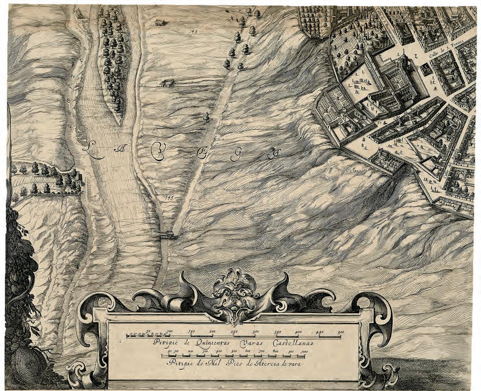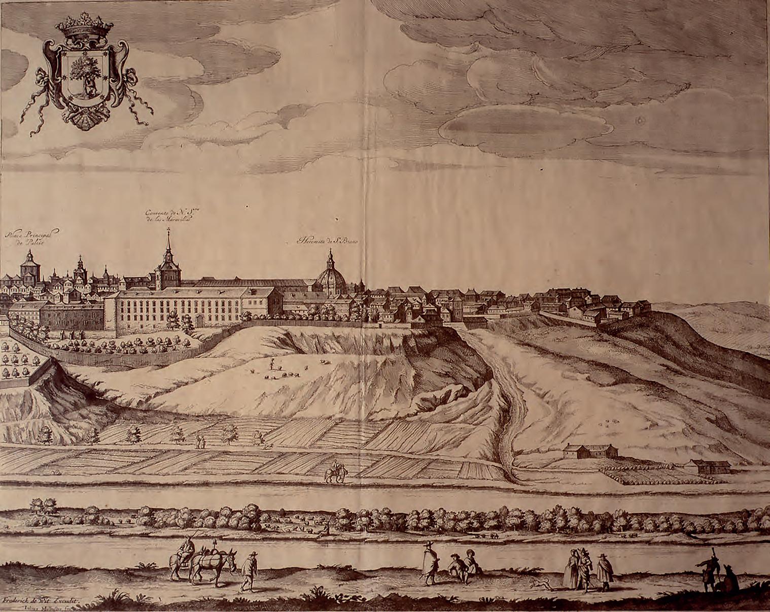 Tras ese vacío, el primer hito lo marca ya entrado el siglo XVII, 1623, el primer plano de la ciudad; un plano de pequeña escala y tamaño modesto [54 x 65 cm, escala 1/4.600] en el que además de calles y plazas su autor, Mancelli, o Mancelli-de Witt, dibuja los volúmenes y fachadas al sur de los edificios de la ciudad. Lo acompañan una selección ilustrativa de vistas parciales en las que destacan un pequeño pero meticuloso grabado y un cuadro de la entonces recién estrenada Plaza Mayor –principal obra pública singular de la ciudad– y vistas de los reales sitios.