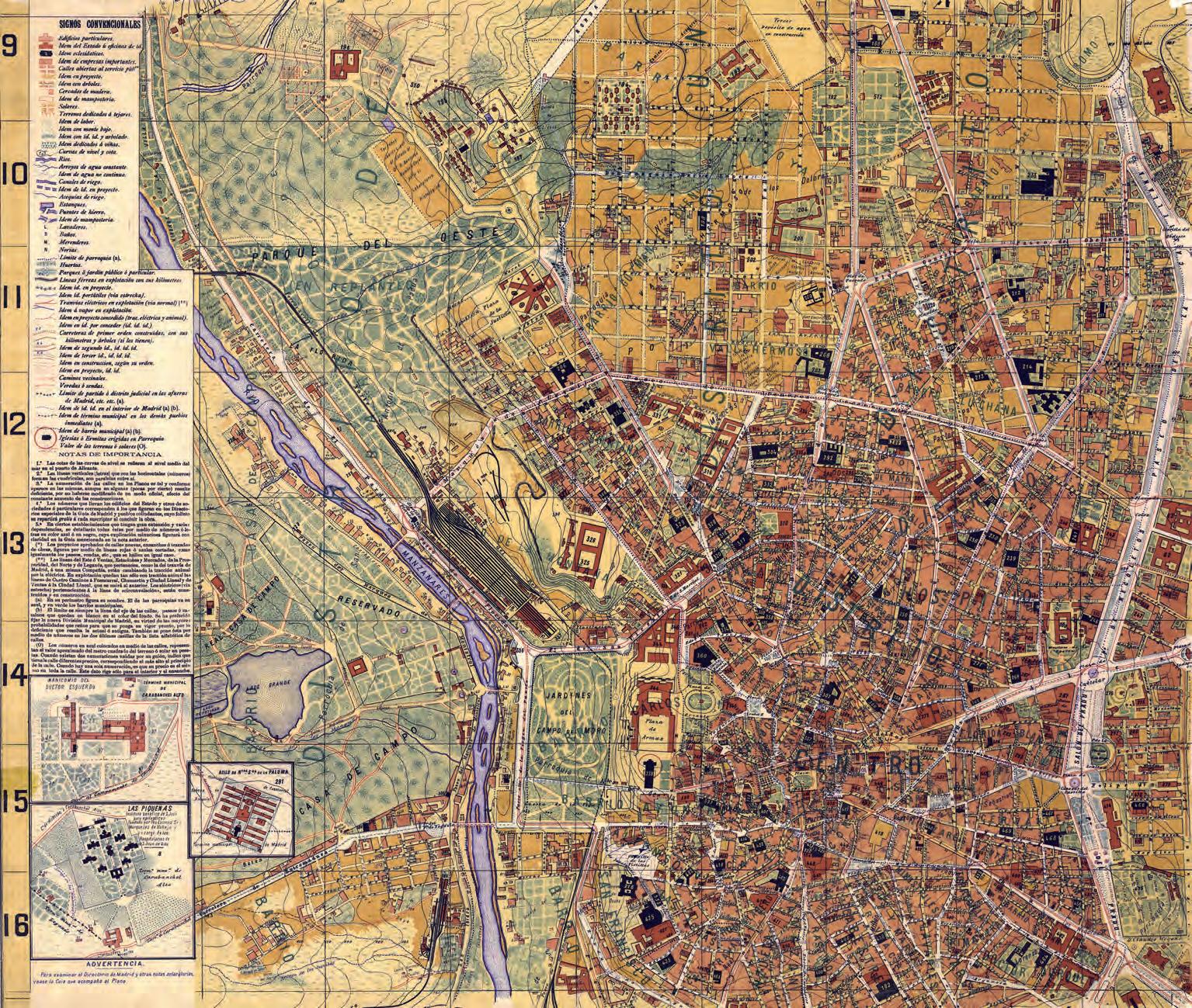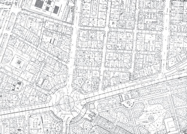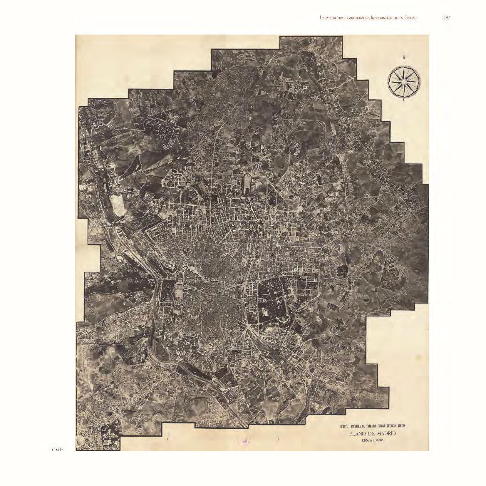 a todo, estos últimos planos siguen siendo por su calidad obras de arte. A finales de los años 20 las cosas cambian. La fotografía aérea y las ortofotos hacen realidad el deseo del viajero: subir a una torre virtual imposiblemente alta para ver la ciudad desde arriba con visión inverosímilmente aguda. Nada escapa al ojo de la cámara. Con base a un ortofoto plano de 1927, la Oficina Municipal elaboró un no-plano gigantesco: 32 hojas a 1/2.000 que unidas resultarían en un documento gráfico inmanejable de tamaño descomunal, 7,20 metros de ancho y 8,40 de alto (para verlo entero, las 32 hojas se integraron en un plano reducido 25 veces, a escala 1/5.000). Su propósito era servir de base para el Concurso Internacional convocado en 1929 para lo que debería ser el primer Plan de Extensión de Madrid, 1929. Como era para lo que era, ganó precisión pero perdió contenidos. Realmente no era un plano de la ciudad, no lo pretendía, sino de alineaciones viarias y rasantes (topografía), aunque siguiendo una tradición no escrita se luce dibujando con primor las trazas y detalles de los grandes jardines públicos. Aquel plano inauguraba una familia de documentos cartográficos inabarcables en los que la ciudad no se ve “de una vez”; tan solo se ven fragmentos. El plano de conjunto cedía para ser soporte fragmentado de proyectos, intervenciones o actuaciones económico-administrativas. El plano imagen daba paso al plano instrumento de trabajo. No se puede ver todo, pero se pueden ver todos los detalles. Atrás quedaban los grandes planos convertidos en elementos a enmarcar, telones de fondo decorativos que dieran un tono culto a despachos oficiales.
