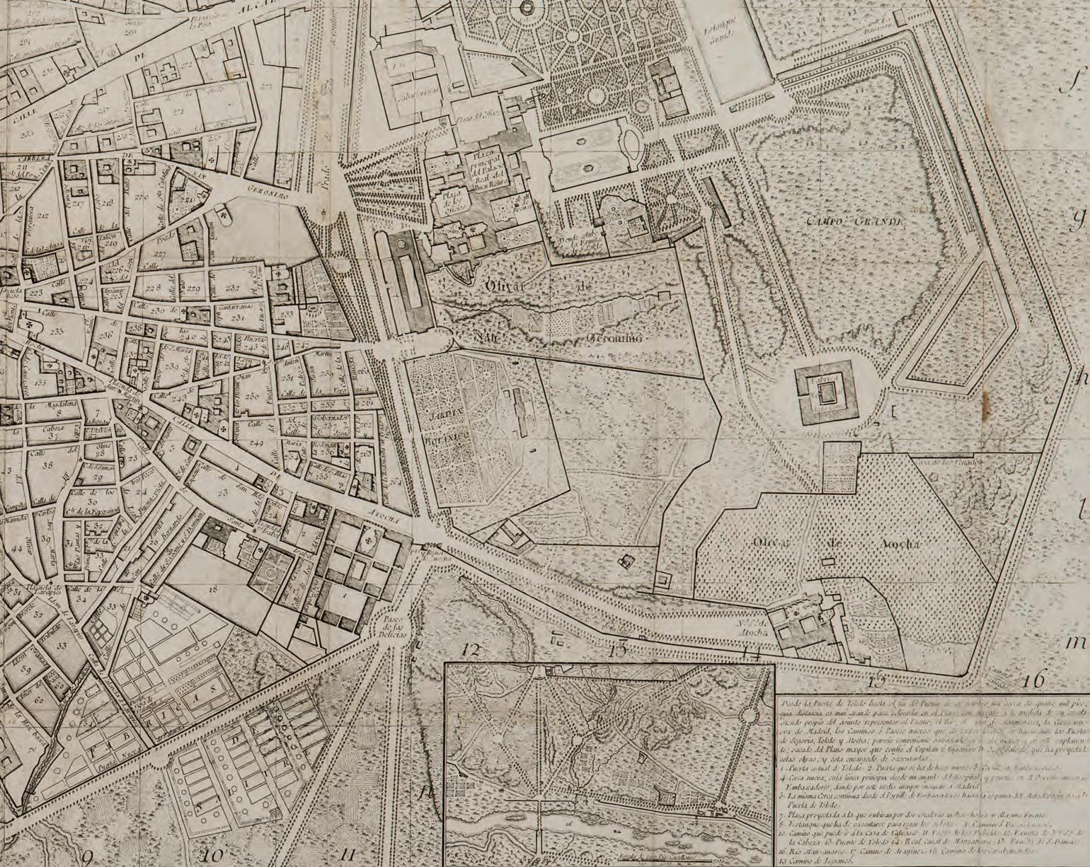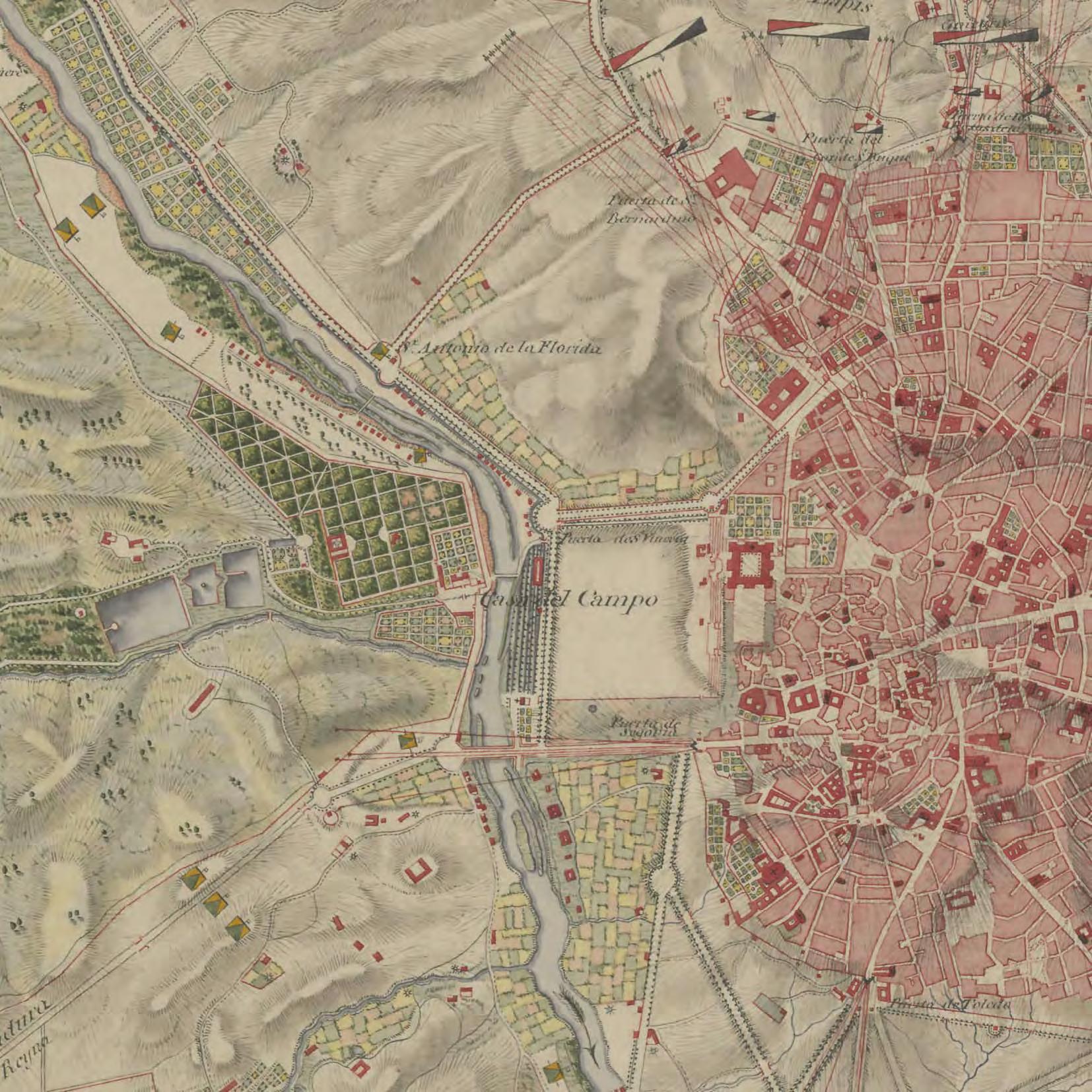 Las vistas que lo acompañan en el libro dan fe del mismo afán de precisión. El siguiente hito lo marca el plano realizado tres décadas después, 1769, por Espinosa de los Monteros. Persigue otros objetivos y tiene otro carácter. No es una descripción realista o figurativa, es un instrumento de precisión para recaudar impuestos (reforma impositiva del Marqués de la Ensenada). De hecho, no nace directamente como un plano, sino que es el resumen simplificado de un sinfín de levantamientos geométricos y parcelarios de cada una de las manzanas de la ciudad. Pese a ser una reducción y limitarse al Madrid intramuros, es también un plano grande [177 x 245 cm] en el que las manzanas aparecen como bloques sólidos y los edificios reales marcados por su silueta. Un plano mudo, casi una guía de calles sin nombre y manzanas macizas que contrastan con el meticuloso casi preciosista detalle con el que dibuja los jardines del Palacio Real y de El Retiro, rasgo que se mantendrá en la mayoría de los planos que vinieron después. De este plano nacieron otros que se reproducen en el libro acompañados de nuevas vistas de la fachada oeste de la ciudad, entre ellos la reflejada como luminoso fondo de escena en el conocido cuadro en el que Goya pintó la Pradera de San Isidro.