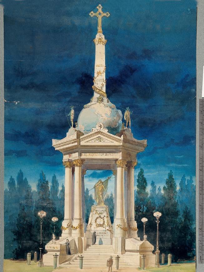 Los derribos de iglesias y conventos producidos por las sucesivas desamortizaciones de 1836 y 1855 dieron lugar a plazas y pasajes comerciales, alamedas, paseos y fuentes que se adornaron con un elegante mobiliario urbano. Los periodos isabelino y de la Restauración impulsaron también el levantamiento de monumentos conmemorativos dedicados a épocas o a personajes gloriosos. Estos monumentos poseen a la vez un significado simbólico y urbano, porque representan a la nación en sus personajes y hechos significativos y porque identifican a la ciudad a la que adornan. El siglo XIX se cierra en la colección con algunos de esos proyectos, como el de 1889 del escultor Manuel Oms dedicado a Isabel la Católica, el de los caídos en las guerras coloniales de 1898, de Mariano Belmás, o el dedicado a Eloy Gonzalo, héroe de la guerra de Cuba, de Jesús Carrasco y Ángel García Díaz.
