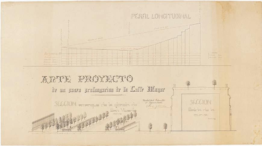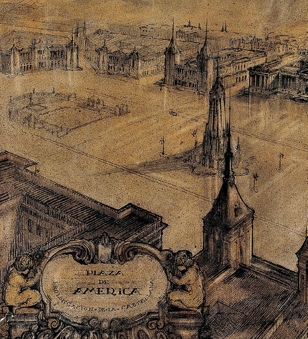 madrileña de organizar un marco digno para su actividad cosmopolita y metropolitana. La progresiva transformación experimentada se puede observar en los croquis de las distintas fases de construcción de la Gran Vía. Esta calle sirvió para comunicar las nuevas zonas de Salamanca, Moncloa y Argüelles con el centro y para ser el emblema de la capital burguesa y comercial. Por su parte, el dibujo de 1924 Plaza de América. Prolongación de la Castellana, del arquitecto y urbanista municipal José López Sallaberry, plantea una suntuosa plaza de las naciones americanas con edificios monumentales en el lugar del antiguo Real Hipódromo, como centro del nuevo eje de crecimiento de la ciudad, de sus comunicaciones y dotaciones. Este proyecto, relacionado con el Plan de Extensión de Madrid, no llegó a realizarse.