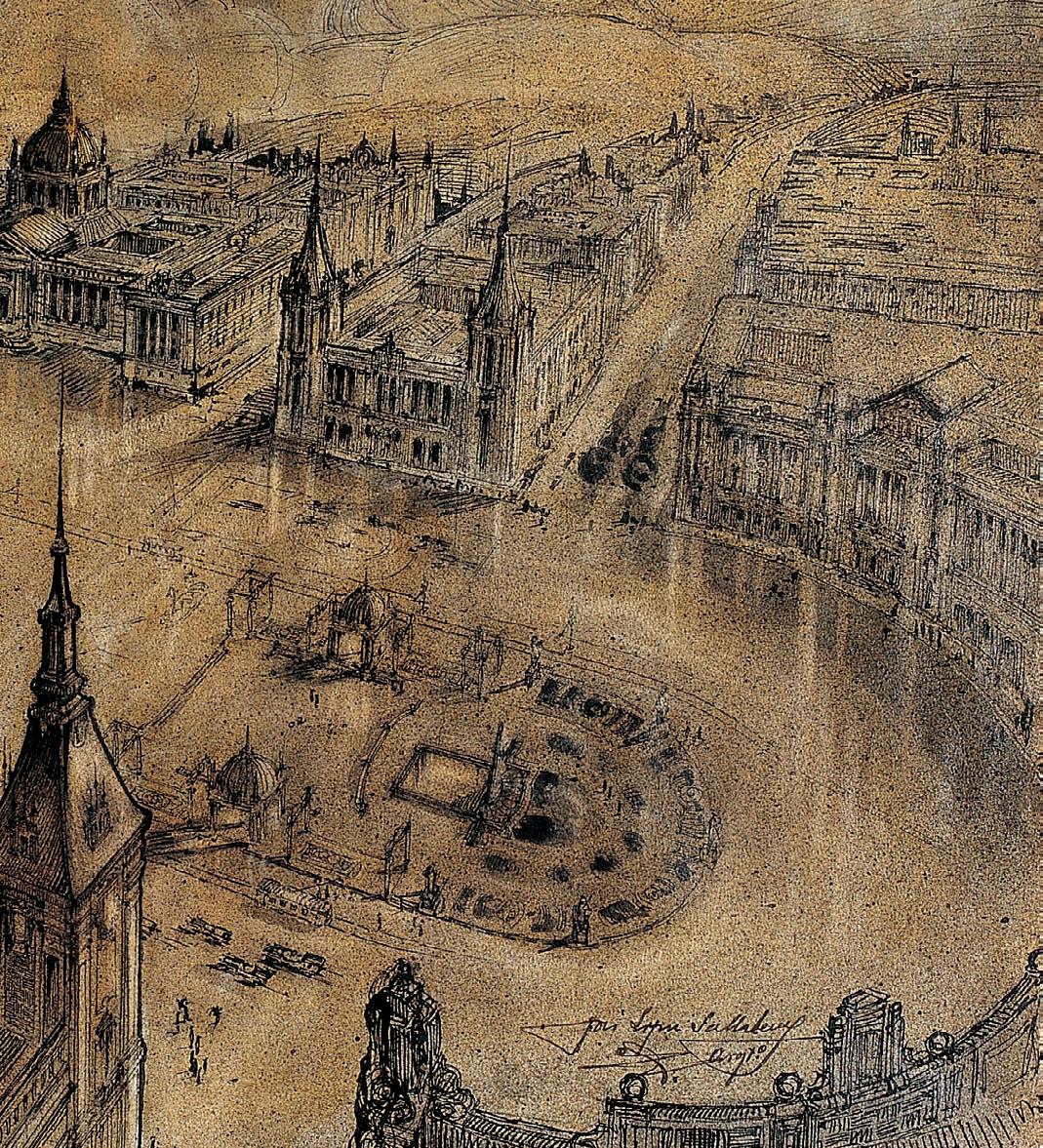 En los dibujos de la segunda mitad de siglo XIX se aprecia el crecimiento de Madrid en proyectos de urbanismo y obras públicas que siguen el modelo francés. La sociedad isabelina aspiraba a transformar Madrid en una nueva capital en la que las comunicaciones fueran el motor de esa transformación, y los monumentos, sus símbolos. La fuerte dinámica económica y social impulsada por una poderosa burguesía originó una naciente industrialización y focalizó una importante inmigración de mano de obra a la búsqueda de trabajo. Ambos factores –desarrollo económico y crecimiento de la población–provocaron las primeras iniciativas para la transformación de la ciudad que se materializarían en varios proyectos de ampliación de sus límites y en los que fue decisivo el derribo de la tapia fiscal de Felipe IV, en 1868. En torno a ese periodo se realizan innovaciones tan significativas como la construcción