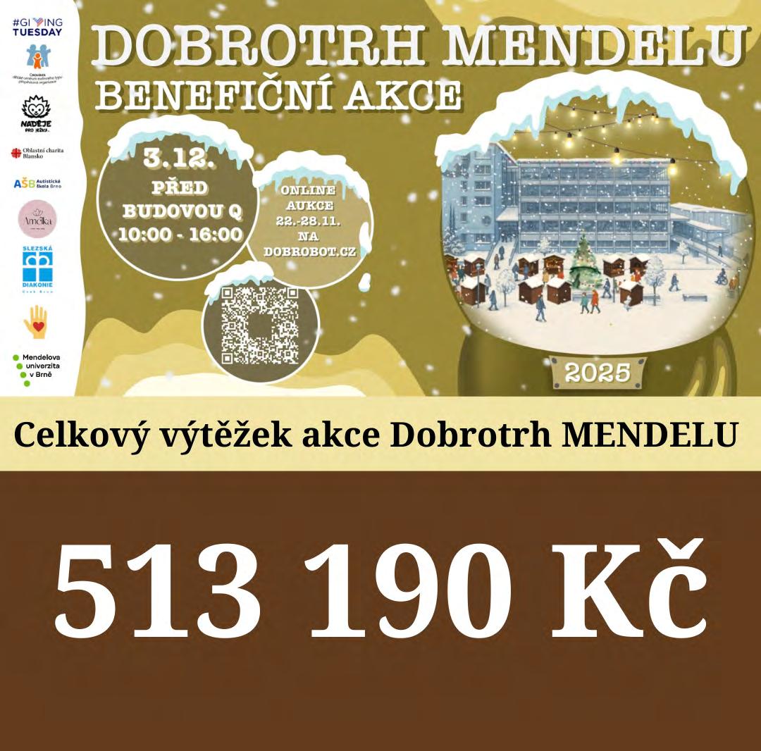 We would like to thank everyone who took part in the 2025 MENDELU Charity Market, whether by physically visiting, by participating in the Dobrobot auction, or by donating on Donio. We truly appreciate your involvement; thanks to your help we rose 513,190 Kč for charity. From the physical market and the online auction we made 132,331 Kč, which will be split evenly between several subjects: sick little Amélka and David, students from a school for autistic children, Slezská diakonie, the Chovánek children’s centre, and a hedgehog rescue station. Another 380,859 Kč was collected through Donio. This money was collected specifically for these entities, and therefore, the donated funds were sent directly to their bank accounts. Because Chovánek did not want to be the recipient of direct donations, we chose a substitute organization: Útulek Tibet, a shelter for handicapped cats and dogs. Special thanks go to our students from the Managerial Skills Seminar, who organized the entire event. These students learned organizational and managerial skills in practice under the guidance of Sylvie Formánková and Renate Kučerová from the Department of Management of the Faculty of Business and Economics. This