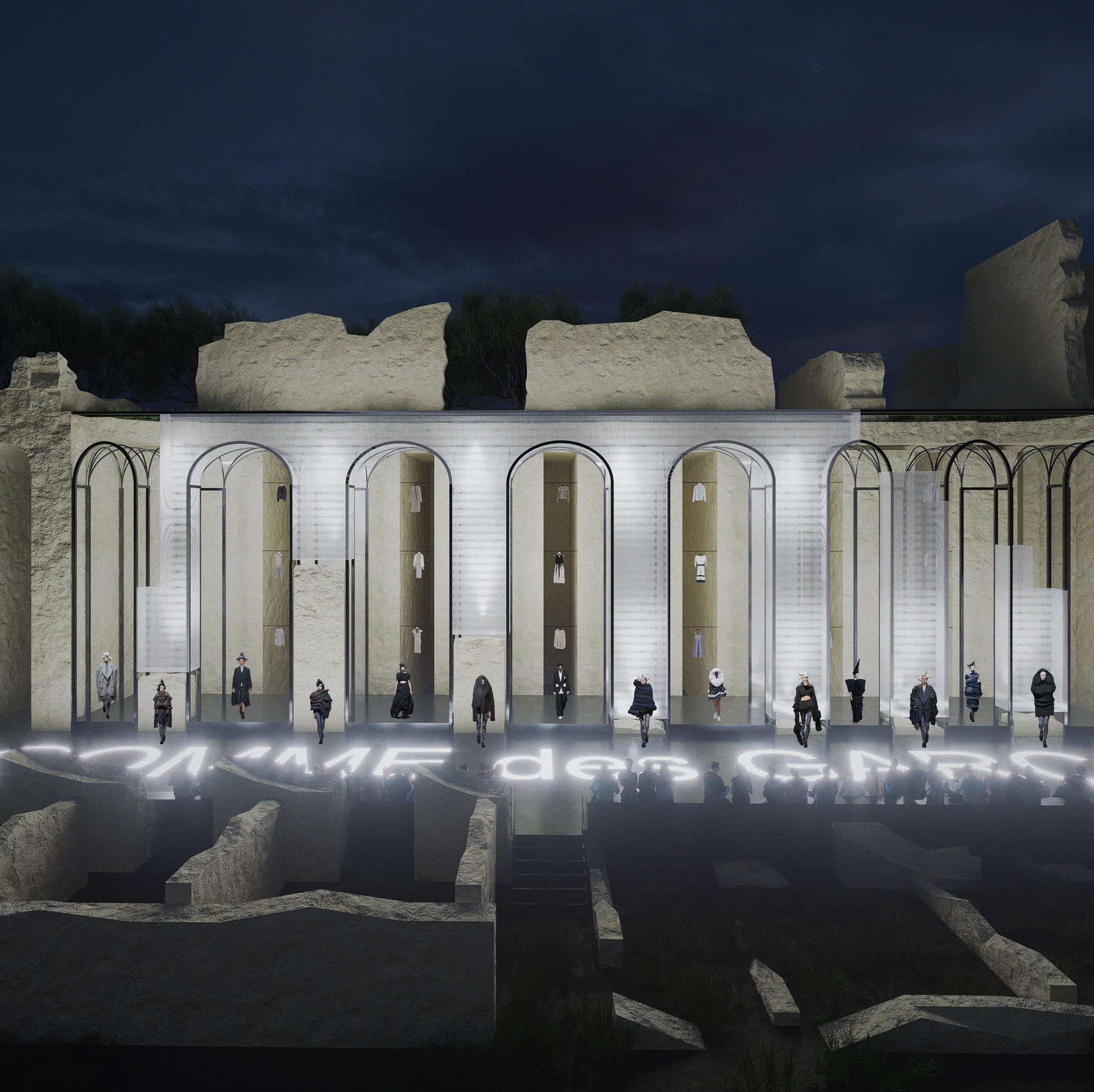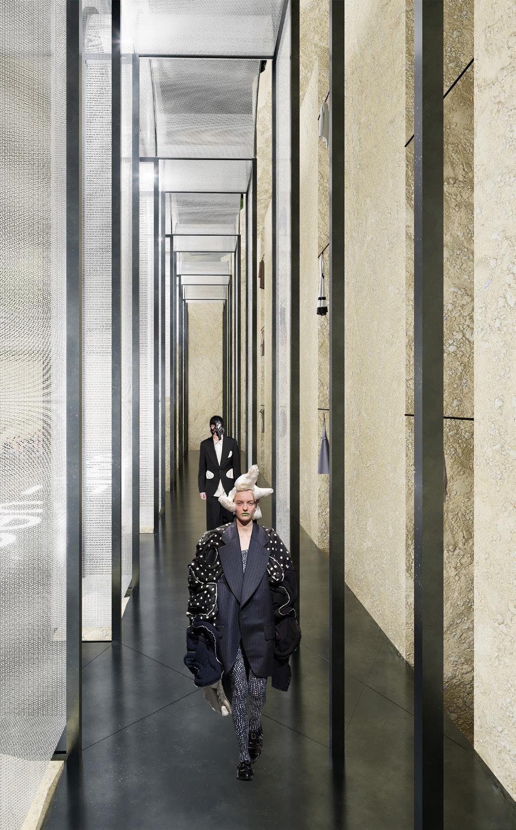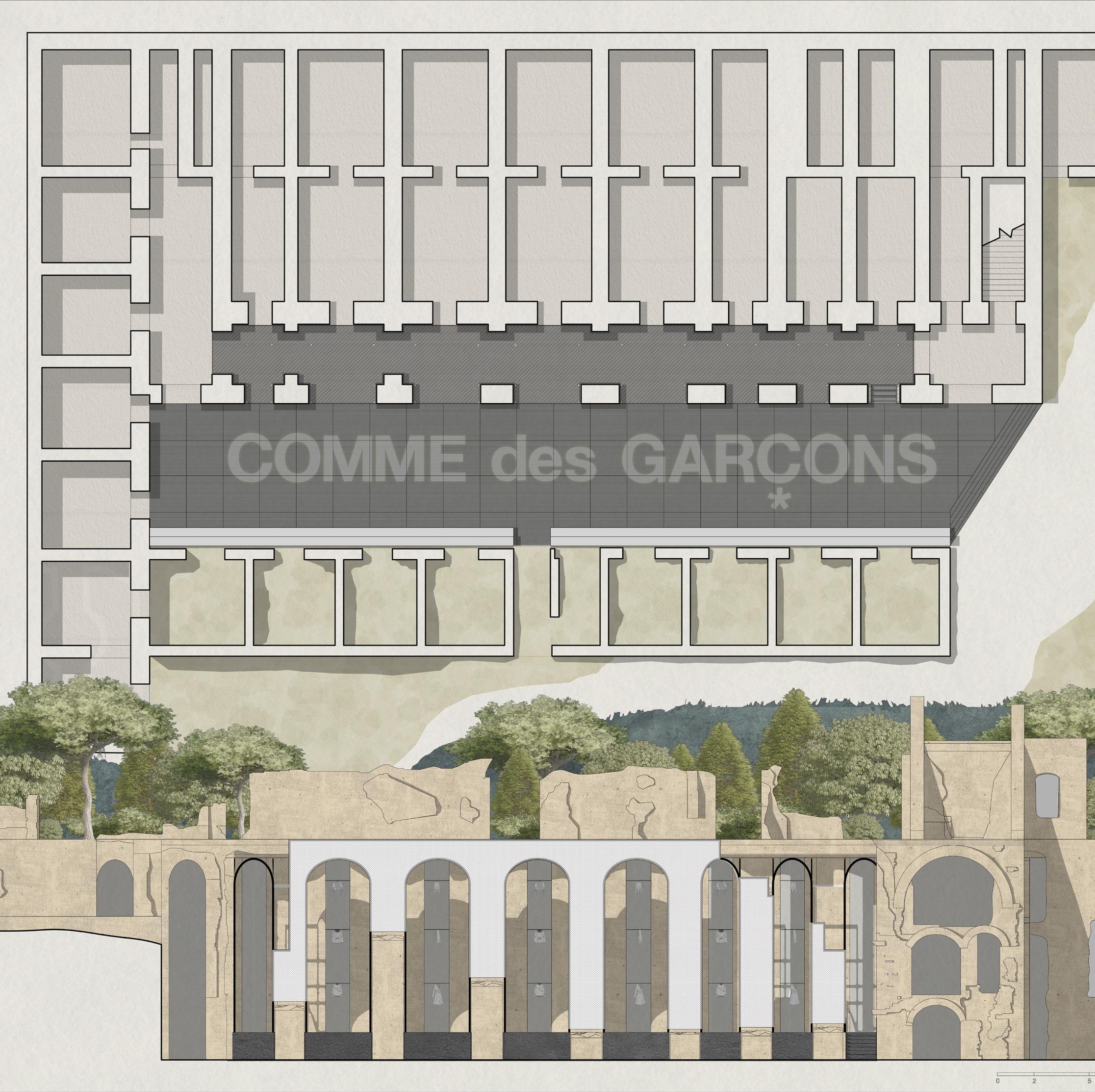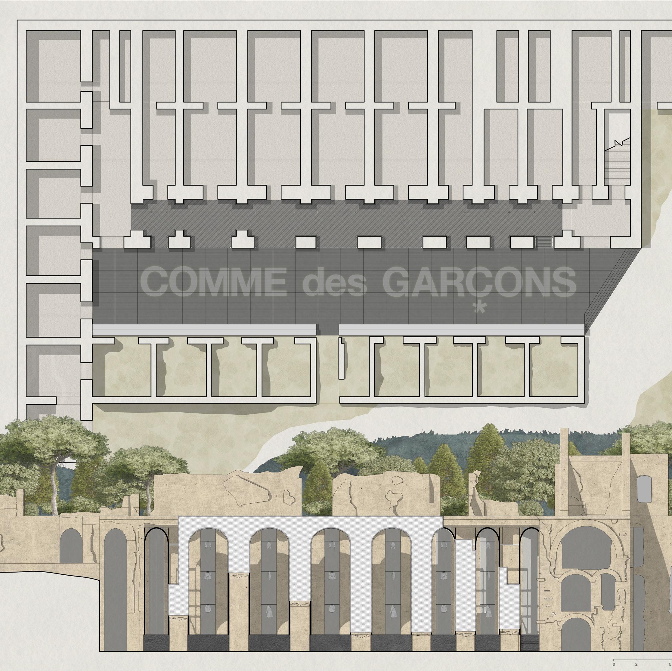 The collaboration between heritage sites and the fashion industry has emerged as a significant trend, blending historical significance with contemporary creativity. This exploration focuses on the convergence of Villa Adriana, a prominent Roman archaeological site, with the avant-garde fashion brand Comme des Garcons, examining their histories, aesthetic concept, and design philosophies.Villa Adriana embodies the architectural legacy of Roman Emperor Hadrian, the pure form of the building and the strict compliance with the axis of the building layout make it a great building complex.The current Hadrian Palace as a ruin also reflects the aesthetic value of ruins as architectural fragments. Founded in 1973 by Rei Kawakubo, Comme des Garcons challenges conventional fashion norms with bold, avant-garde designs. Her designs embody the Japanese aesthetic concept of "wabi-sabi". The project delves into the intersection of heritage and fashion through the design concept of "Look through the Hole" and the aesthetic value of "Wabi-sabi," aiming to unveil the beauty inherent within Villa Adriana's fragmented ruins.