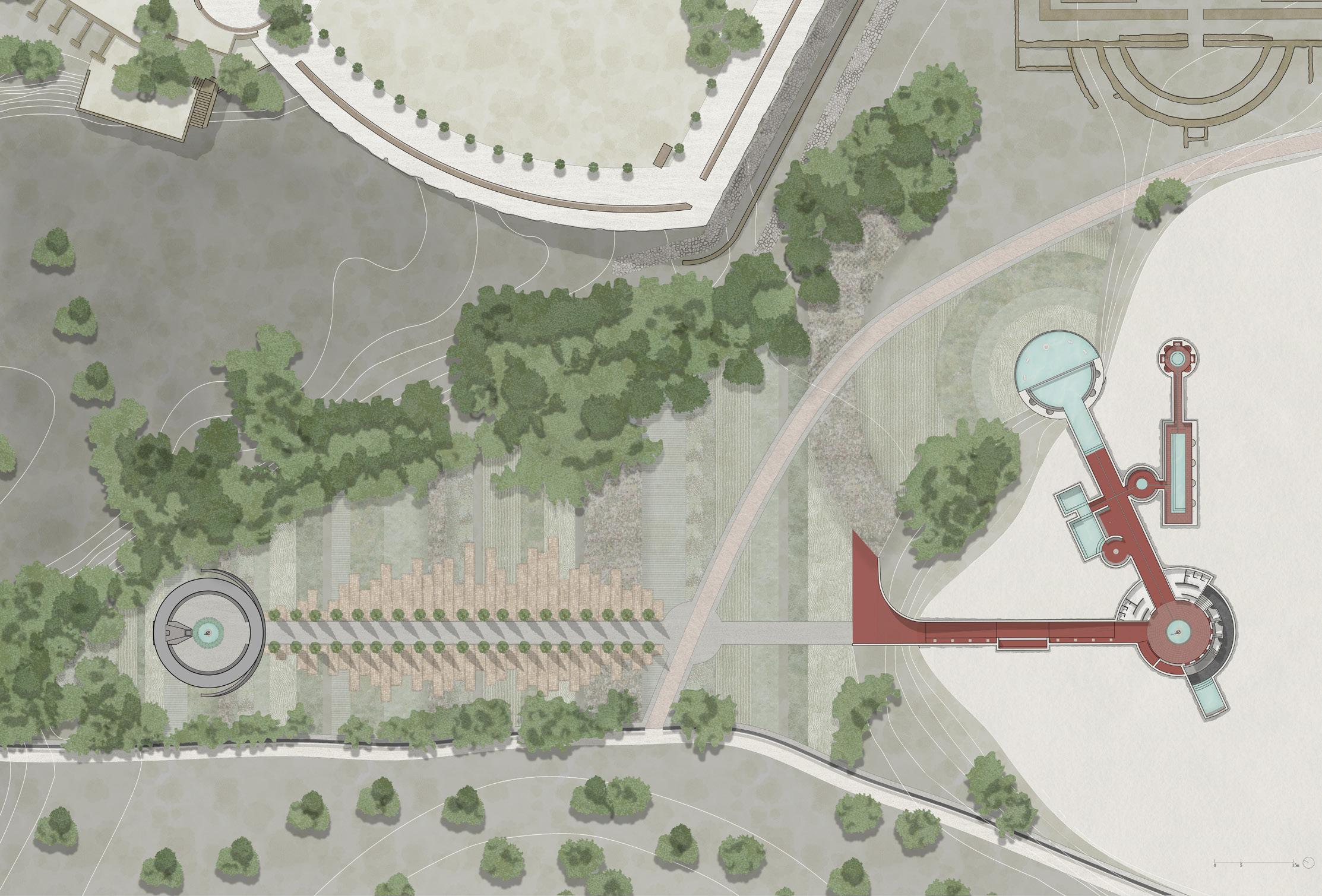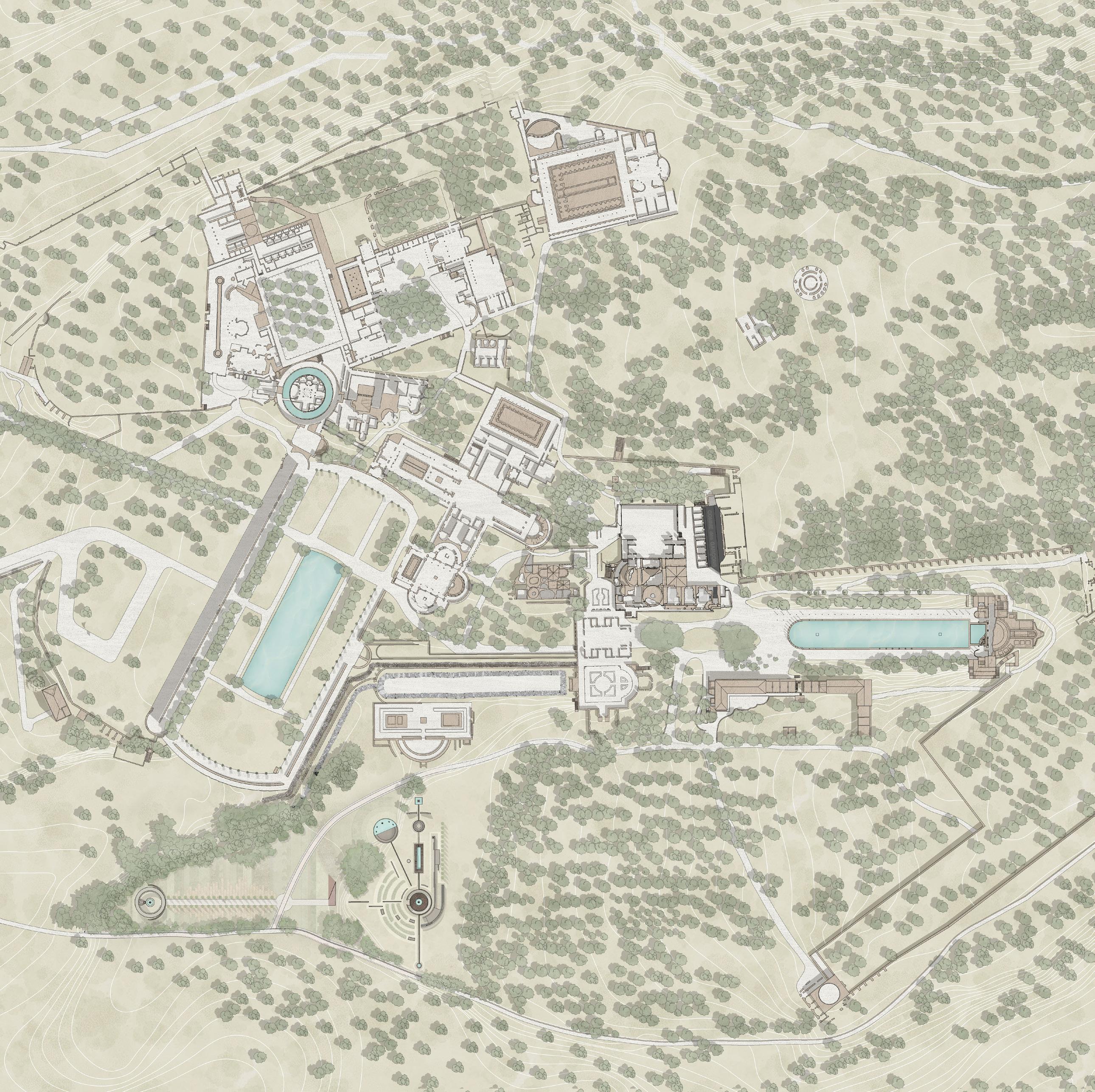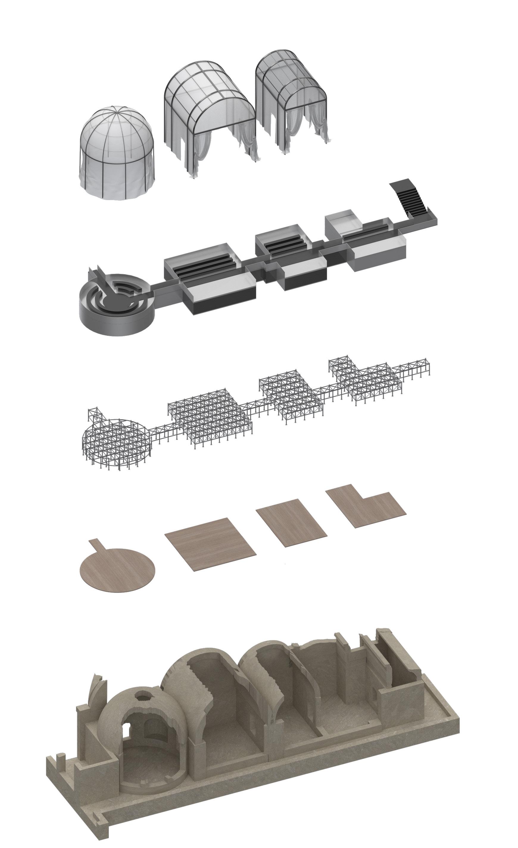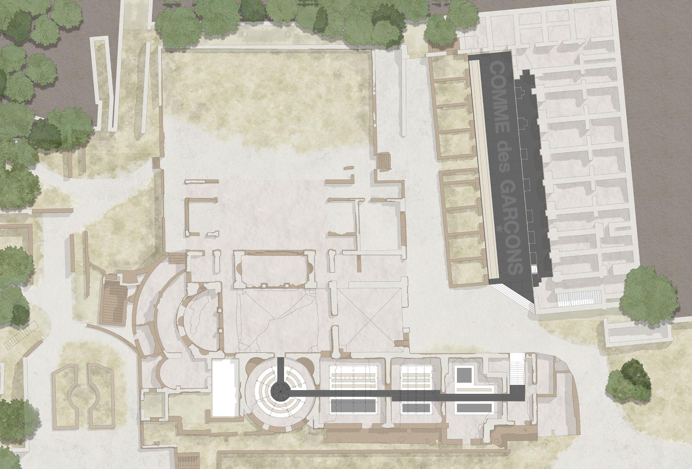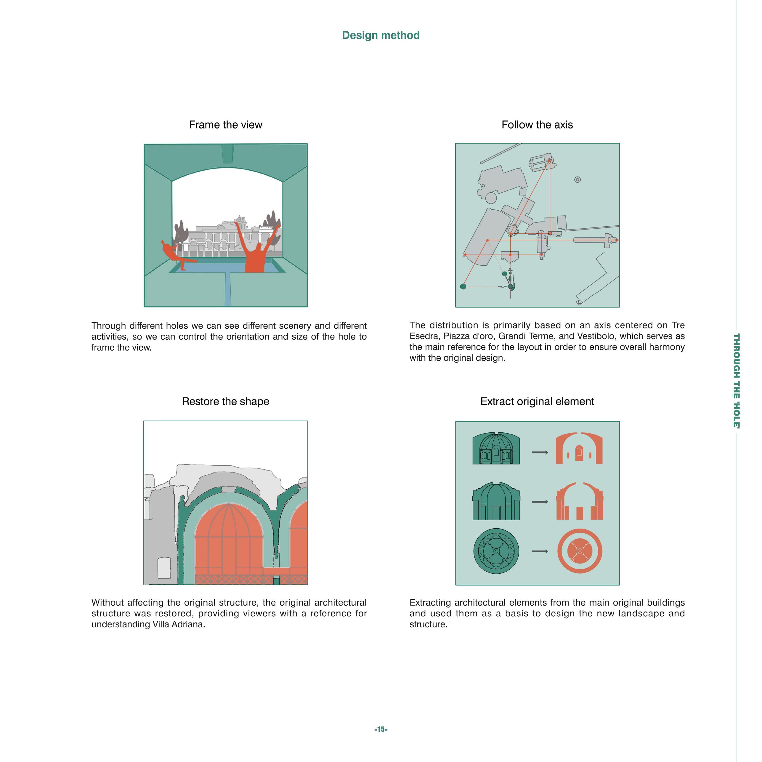 The collaboration between heritage sites and the fashion industry has emerged as a significant trend, blending historical significance with contemporary creativity. This exploration focuses on the convergence of Villa Adriana, a prominent Roman archaeological site, with the avant-garde fashion brand Comme des Garcons, examining their histories, aesthetic concept, and design philosophies.Villa Adriana embodies the architectural legacy of Roman Emperor Hadrian, the pure form of the building and the strict compliance with the axis of the building layout make it a great building complex.The current Hadrian Palace as a ruin also reflects the aesthetic value of ruins as architectural fragments. Founded in 1973 by Rei Kawakubo, Comme des Garcons challenges conventional fashion norms with bold, avant-garde designs. Her designs embody the Japanese aesthetic concept of "wabi-sabi". The project delves into the intersection of heritage and fashion through the design concept of "Look through the Hole" and the aesthetic value of "Wabi-sabi," aiming to unveil the beauty inherent within Villa Adriana's fragmented ruins.