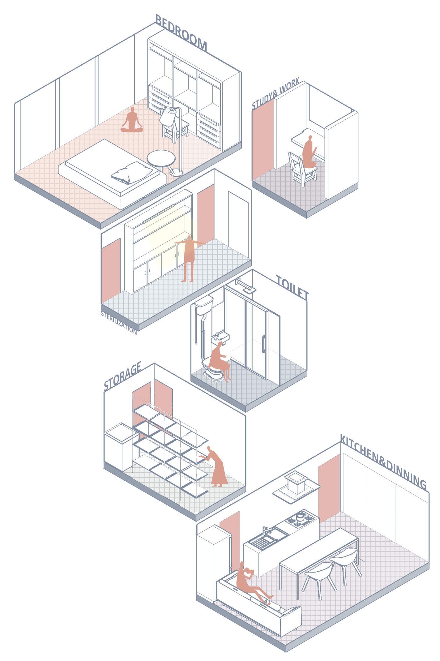 The epidemic has changed the way of life, and thus the way of living. We had to isolate ourselves at home, and for a while 'home' took on more meaning. If a 'home' was part of society, now the 'home' has become a small society independent of the outside world. It insulates and protects us from the outside world. What are the limits of one living space for one person? How to ensure the quality of life and adapt to the new requirements with minimal space in the current epidemic? tried to make ‘home’ as a 'shelter' instead of a 'cell'.