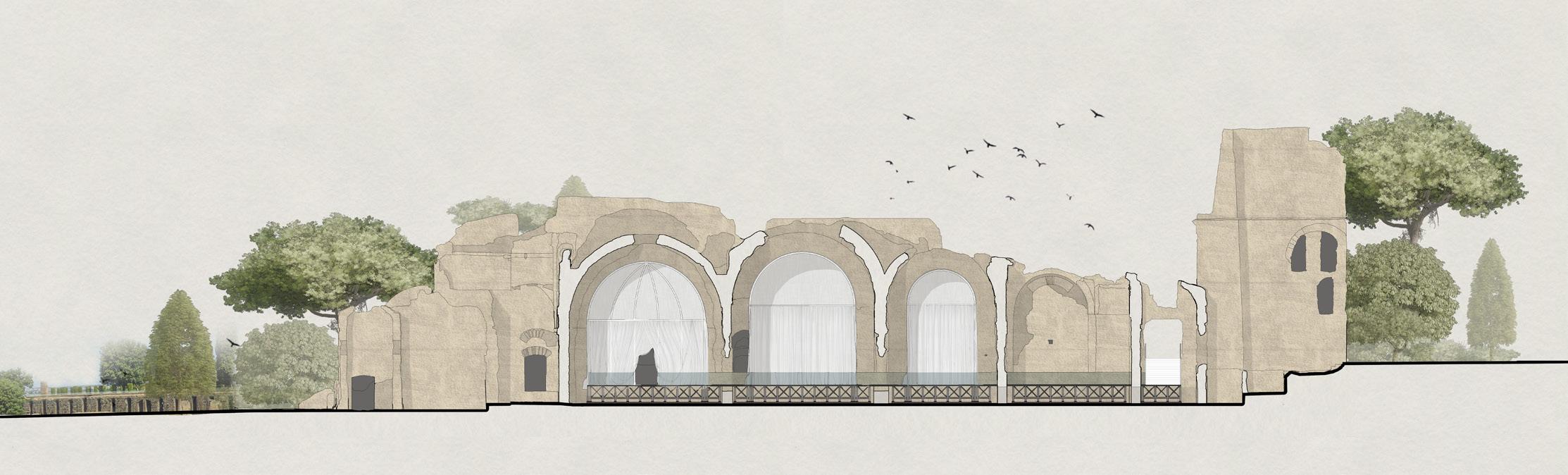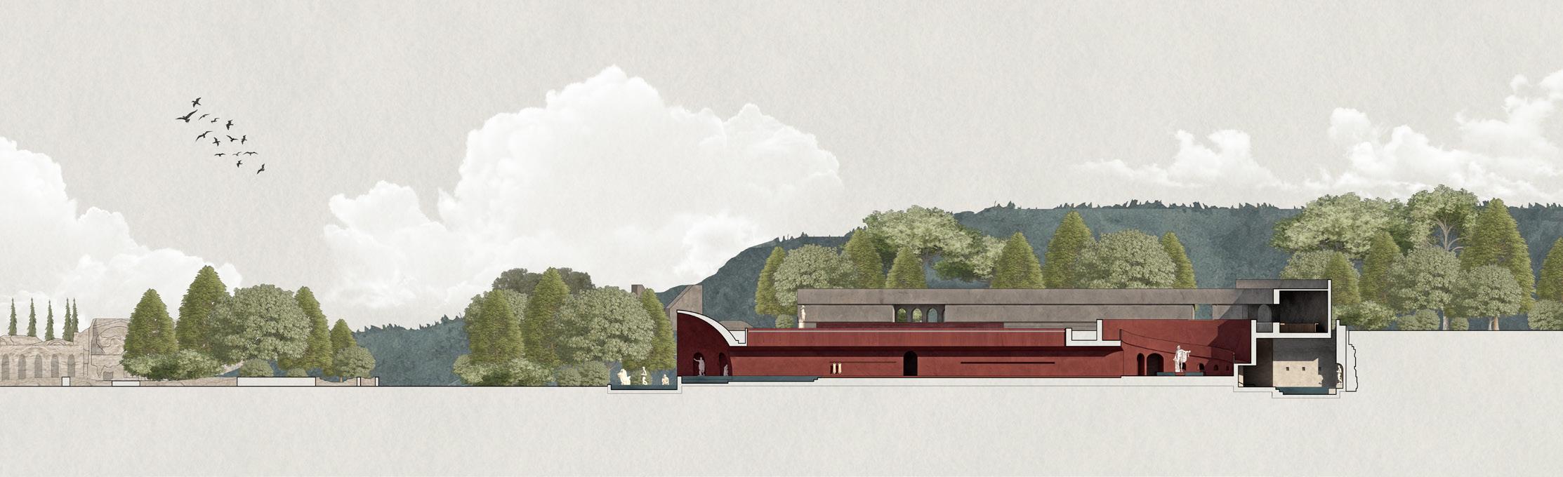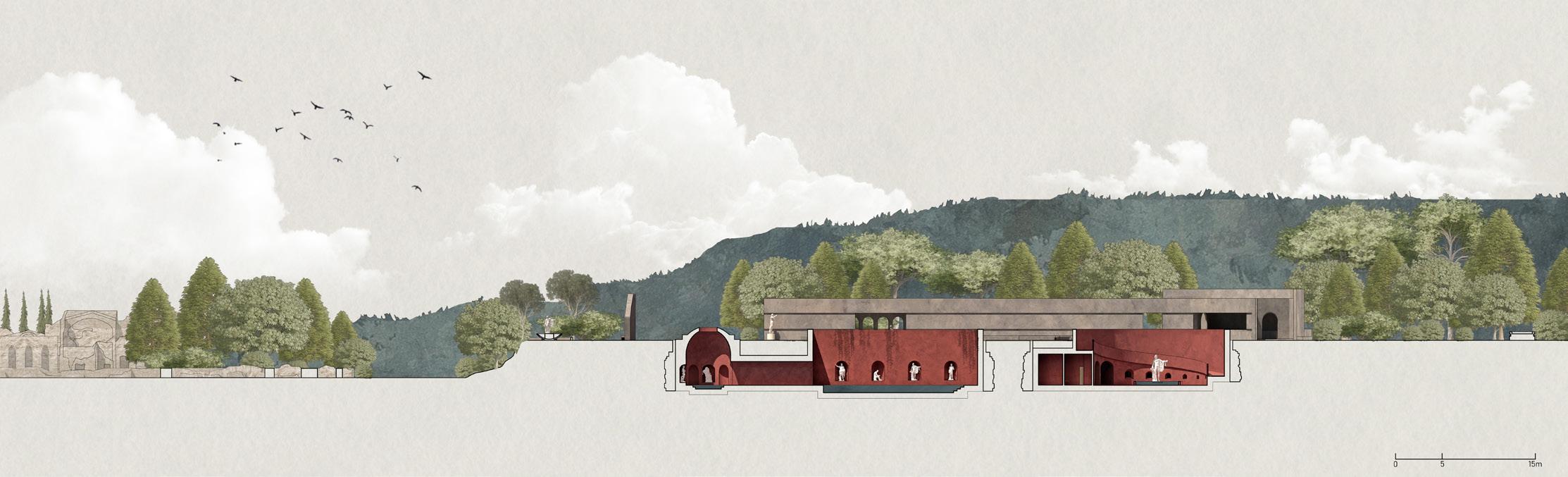 This philosophy finds application in design practices, notably evident in exhibitions at Villa Adriana. Despite its current dilapidated state, we aim to showcase its present ruins by employing the concept of caves. Herein lies an interpretation where "the cave" represents fragmented gaps within the palace structure; it is through these crevices that we hope audiences may perceive alternative beauty inherent within this architectural marvel.