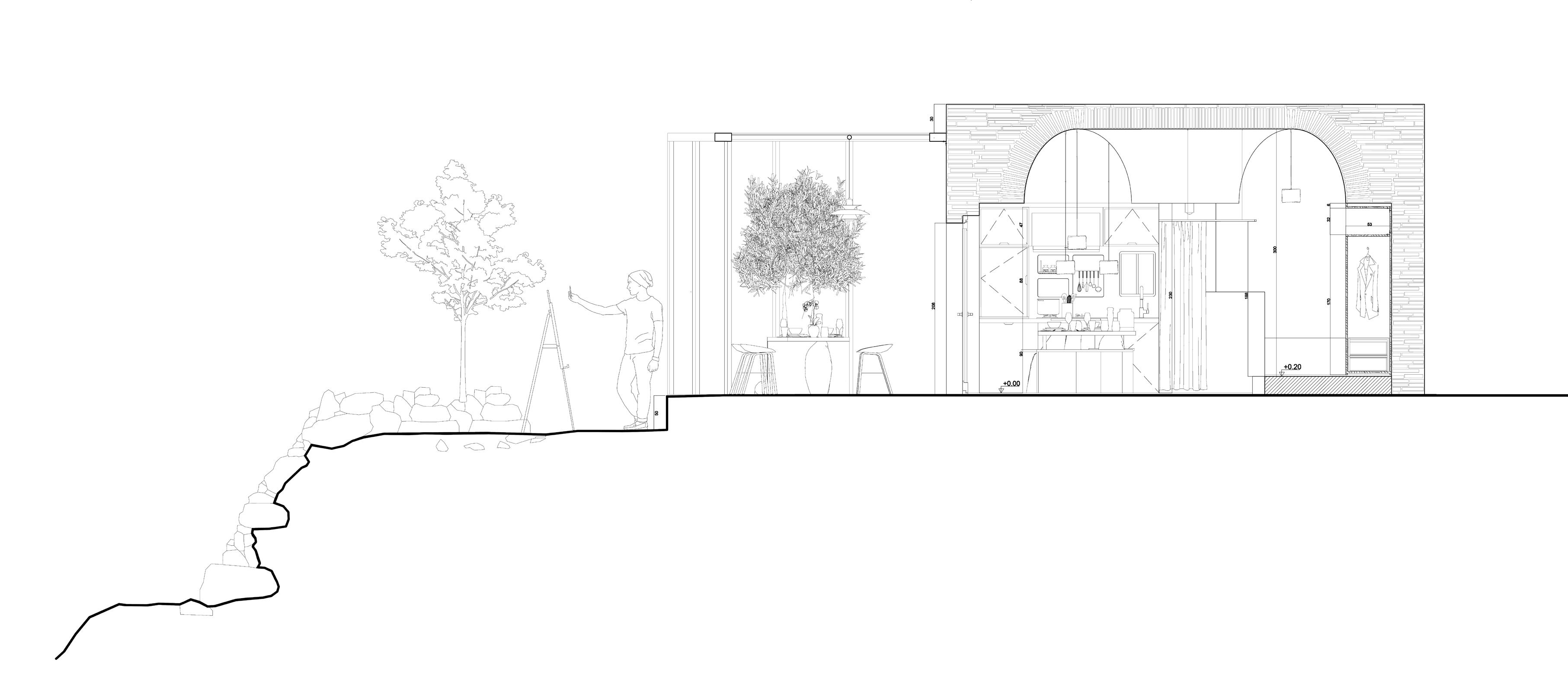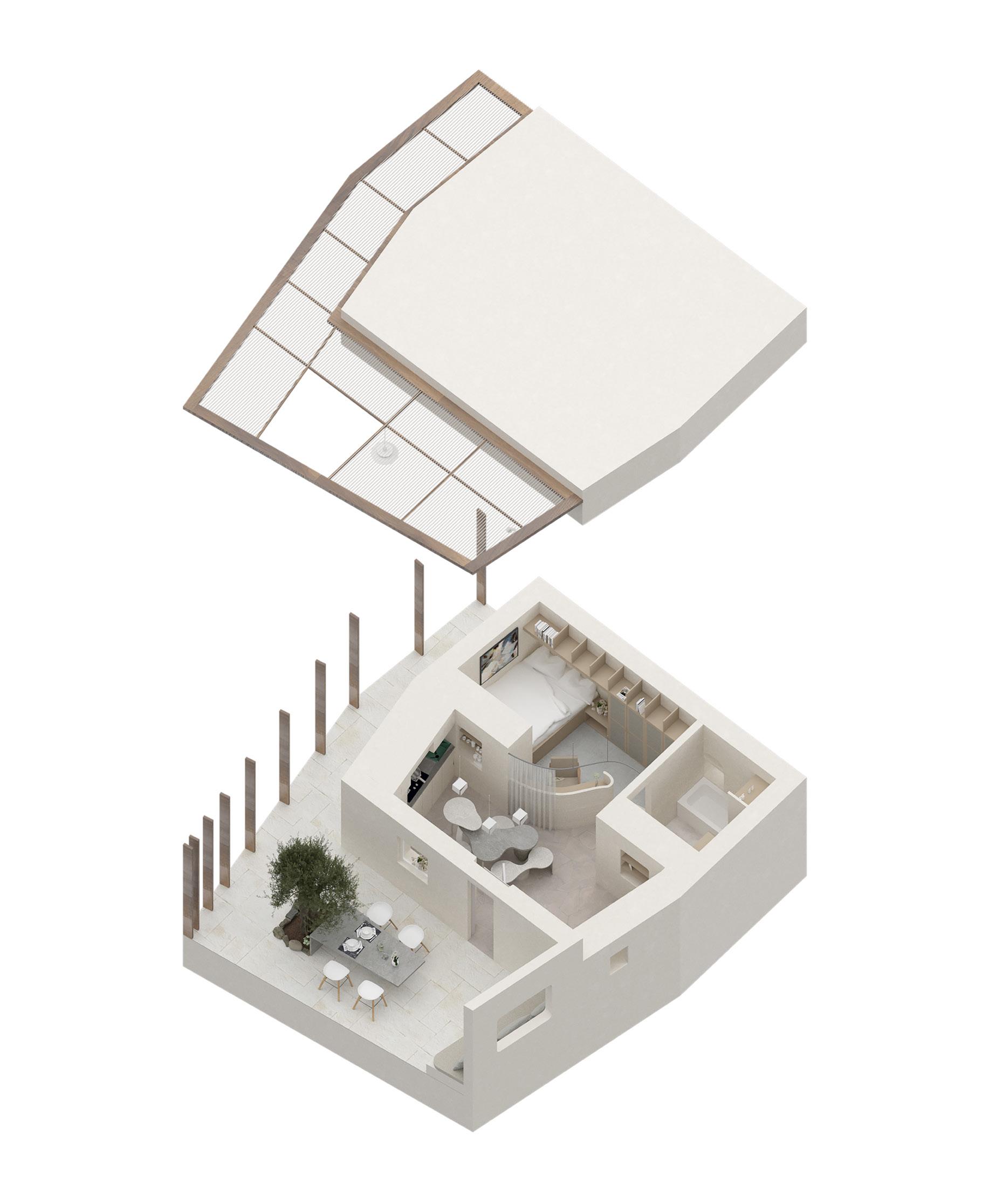 The house is located on an island in Greece, named Tinos. The undulating terrain and vast sea view contribute to the elegant environment of the house. The existing house was constructed with the traditional materials, which enclose a small space with the typical thick wall. We divide the space diagonally to increase space utilization. Vertically, using the parapet to have certain view blocks to increase the privacy of the certain space. In addition, we designed multi-use furniture, making the function of the space has can more possibility. And with the unity of furniture's material and style to ensure the general homogenous of the whole indoor style.