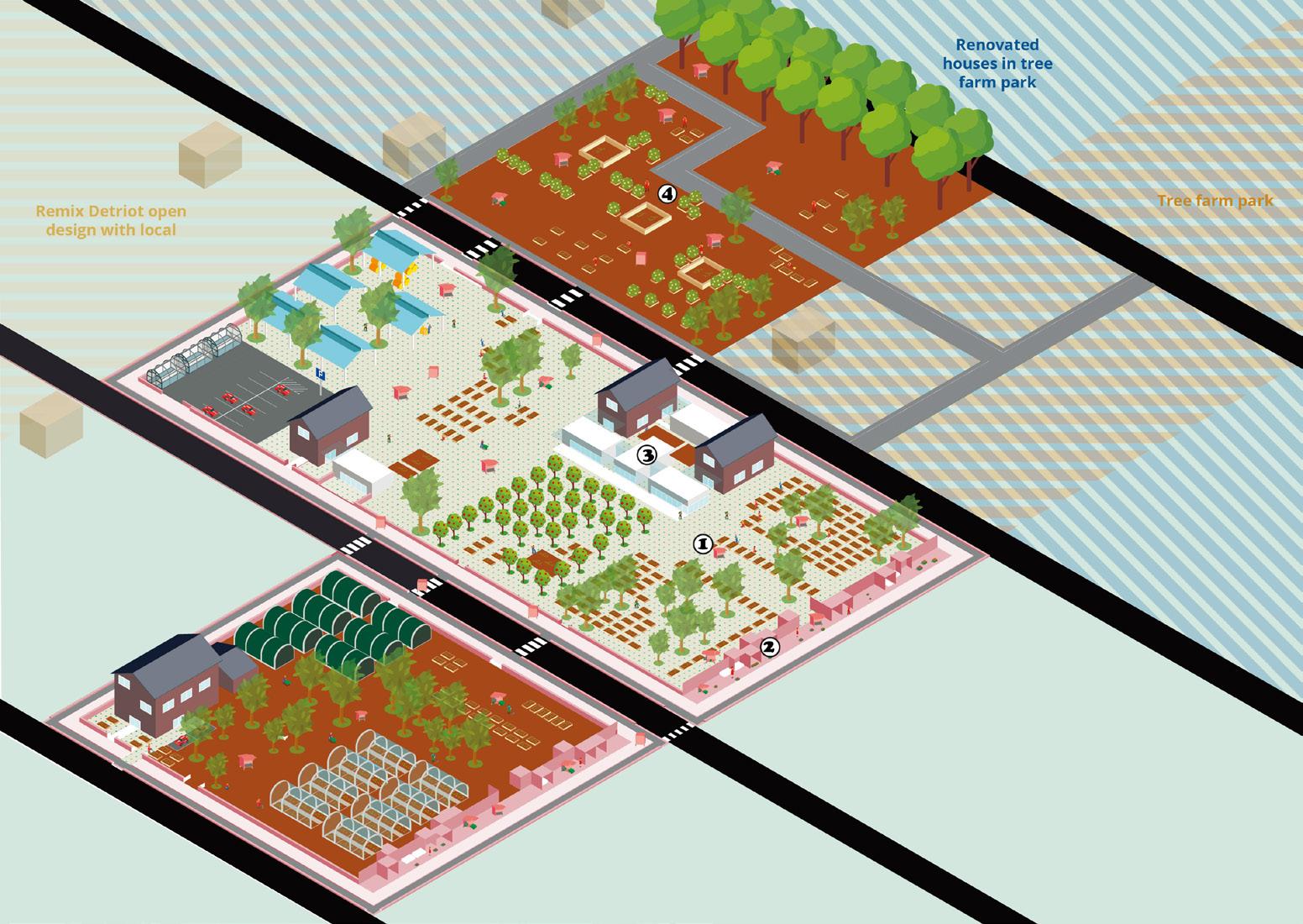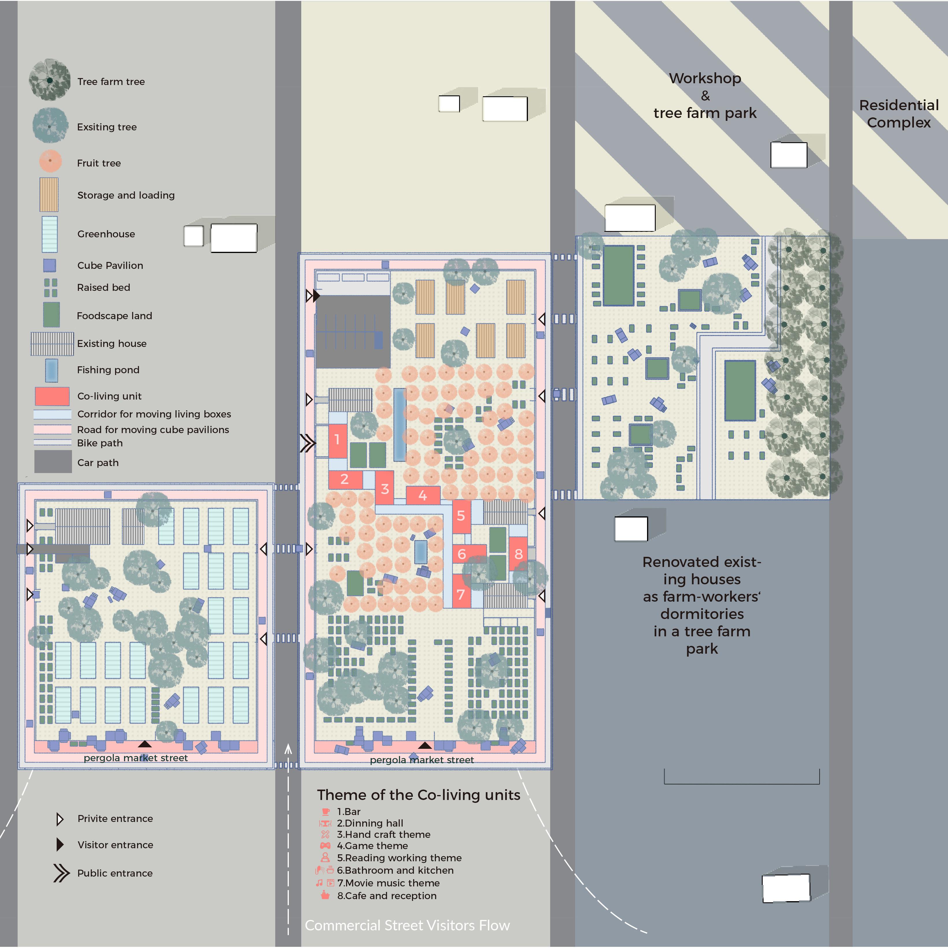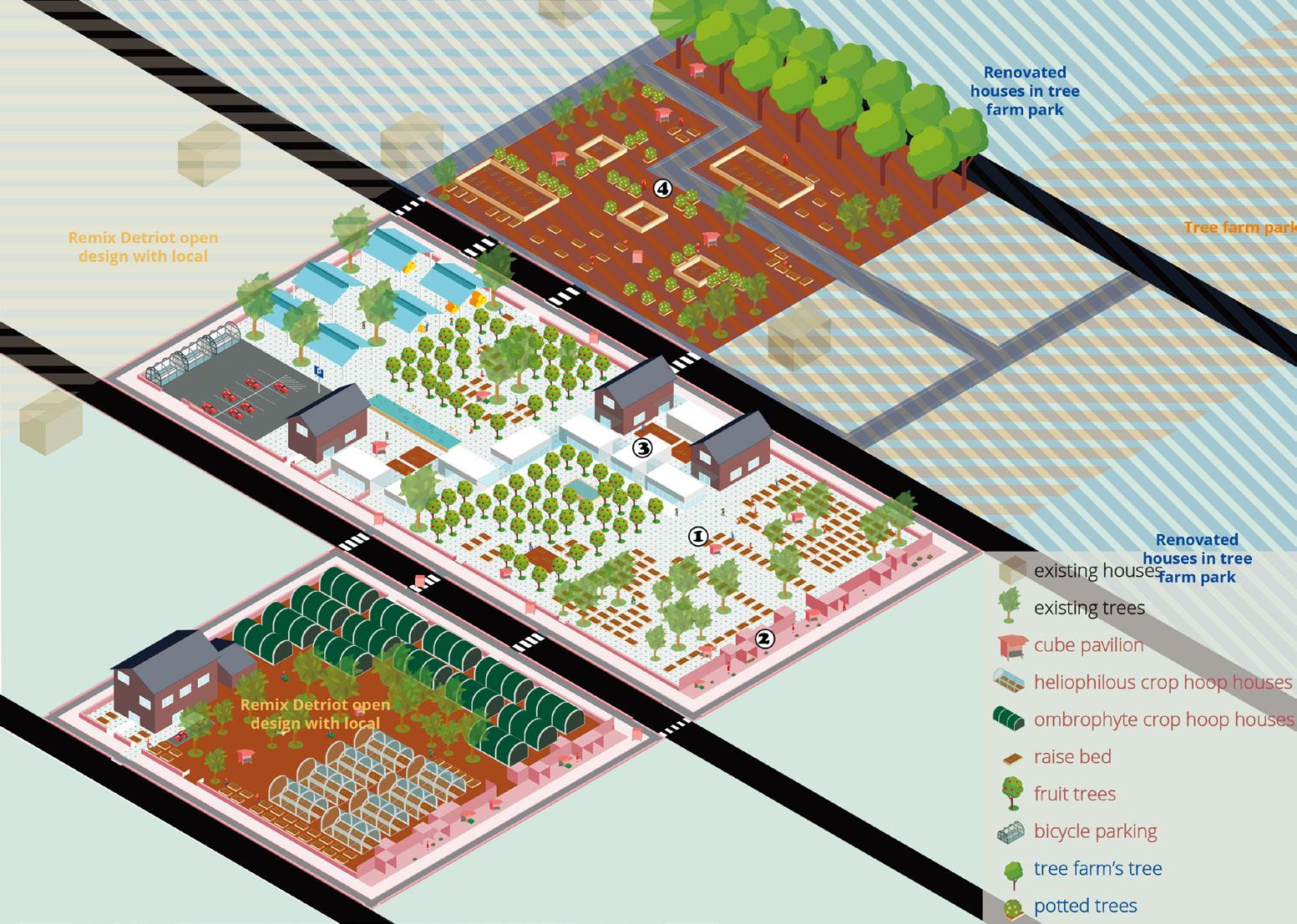 In Detroit, the studio simulated the process of an architect designing an entire project for a client, starting with a contract and following the client's requirements. Set up an economically sustainable friendly farm that caters to other client projects around it. For that aim, we designed a farm-based Co-living community. To save upfront investment and risk, we divided the project into two phases, which can develop step by step within several years. The mobile box is the main element to enhance the flexibility of the space and provide customers with a variety of activity spaces. As well as facilitate communication throughout the region.