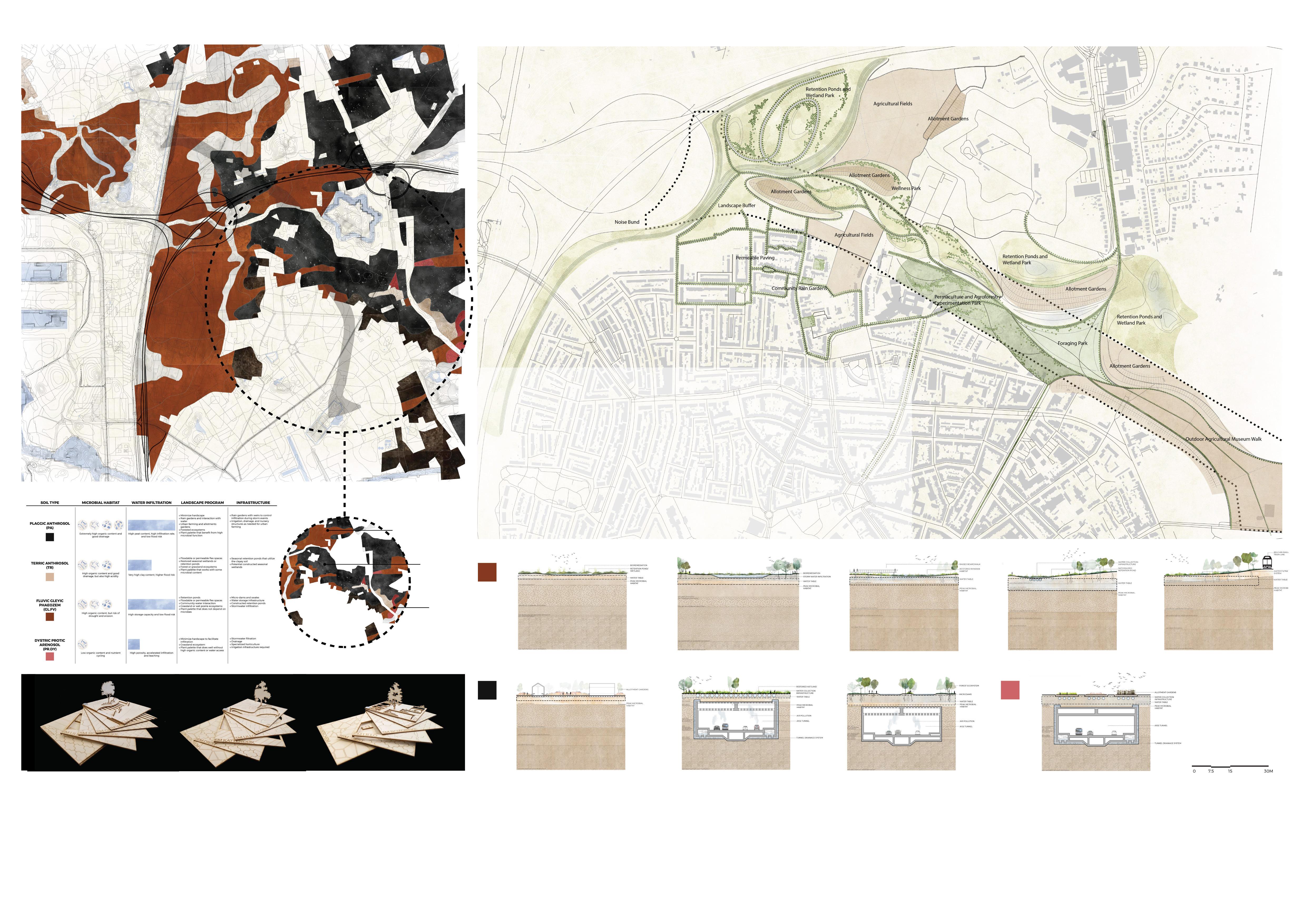 Contribu�on: I joined the project team at the end of its schema�c deisgn phase. I made diagrams and technical drawings from the 3D model, rendered the masterplan for this project, and modified details in the 3D model.