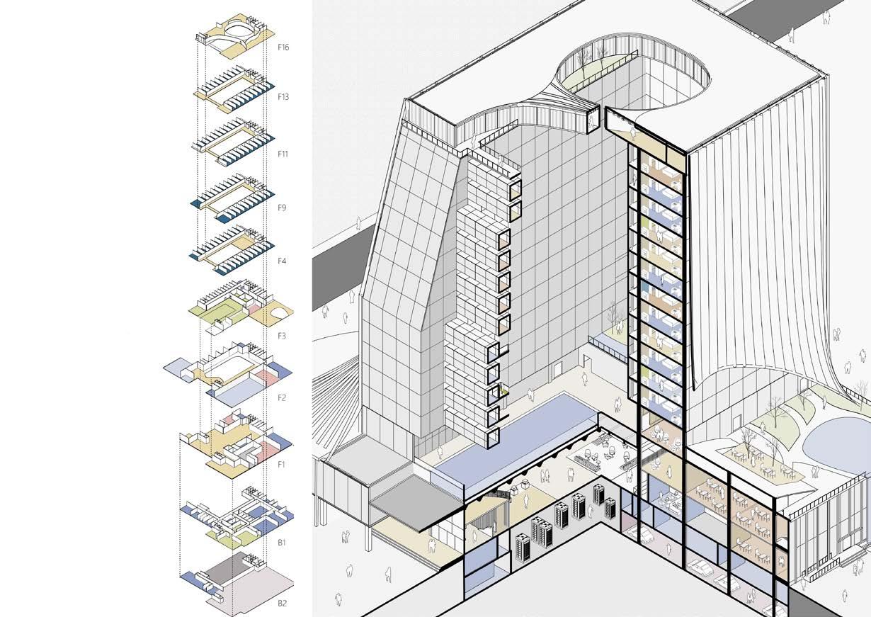 The design aims to create a four-star business hotel that prioritizes guest comfort while offering unique leisure amenities and communal spaces for interaction. The title "Encounter" is inspired by the concept of meaningful connections and shared experiences. Situated on Wangfujing Street, this hotel serves as a contemporary landmark, blending seamlessly into its urban surroundings.