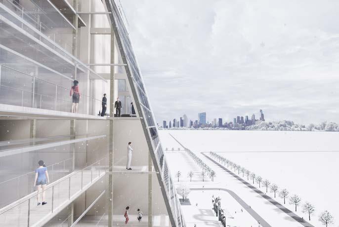 The site, near an intersection, features stunning views of the Wangfujing block and the Forbidden City to the west. To enhance these vistas, the high-rise is strategically recessed on its western side, with shared atriums and rest areas, emphasizing landscape inclusivity and sharing through refined structures and panoramic spaces.