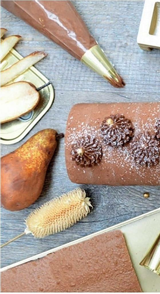 Coffret buche de Noël Contient : 1 moule à bûche, en silicône + 1 moule insert, en silicône + 1 tapis gênoise, semelle en silicône + 1 support à gâteaux 'doré' réutilisable + 1 livre de recettes. 068978