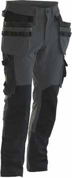 90% polyamide, 10% elastane, 240g/ m². Pantalon de travail confortable, extensible dans les 4 sens comportant des sections de textile durable tissé au niveau de la cheville, des poches jambe et des poches étuis. Poches étui détachables à compartiments supplémentaires et renforts internes.