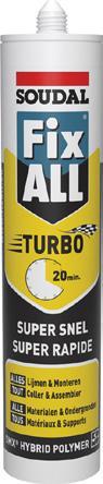 Soudal Fix ALL Turbo est un mastic-colle, à base de SMX polymères, neutre et élastique, avec un établissement de force rapide. 720124805 - 5411183120075