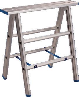 4 échelons. Ht. fermée 1,80m, ht. ouverte 1,00m. Aluminium. Avec bac à outils, plateforme à charnières. Conforme aux normes EN131 et NEN 2484. Certifié VGS & Warenwet. Disponible de 2 à 12 marches. 355011/D - 656 020 04