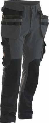 90% polyamide / 10% elastaan, 240g/m². Comfortabele werkbroek in 4-way stretch met delen slijtvaste geweven stof aan de enkels, beenzakken en holsterzakken. Afritsbare holsterzakken met extra compartimenten en versterkte binnenkant. Maten 44-62.