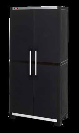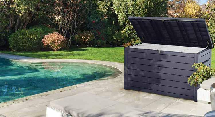 Le couvercle s'ouvre et se ferme facilement au moyen d'un ressort à gaz • Des roues sont fixées sur un côté du fond afin que le coffre puisse être déplacé facilement • Poignées sue les côtés • Arctic grey