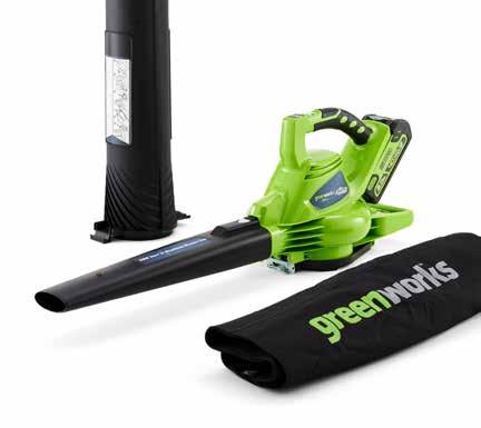 40V • 4,0Ah • Aspirateur, souffleur et broyeur • Vitesse de soufflerie max. 280km/h • Bouton de réglage « faible/forte » • Interrupteur de sécurité • Régulateur de la vitesse de soufflerie • Ratio de broyage 10:1 • Sac récolteur 45L • Poignée soft-