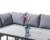 Cadre en aluminium, anthracite. 2 bancs 3 places. L222 x P74 x H26cm. Table basse avec plateau polywood L71 x l71cm x H26cm. Avec coussins Olefine 200g gris foncé. Le plateau, le coussin et les dossiers sont interchangeables.