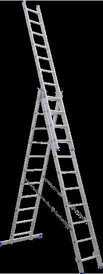 ALUMINIUM REFORMLADDER 'STABILO II' 3 x 9 treden • In aluminium: licht in gewicht en gemakkelijk hanteerbaar • Stabiliteitsbalk voorkomt het wegzakken in onverharde grond • Met extra stabiliteitslint als spreidstandbeveiliging • Eenvoudig in A-stand te plaatsen door de stevige reformscharnieren