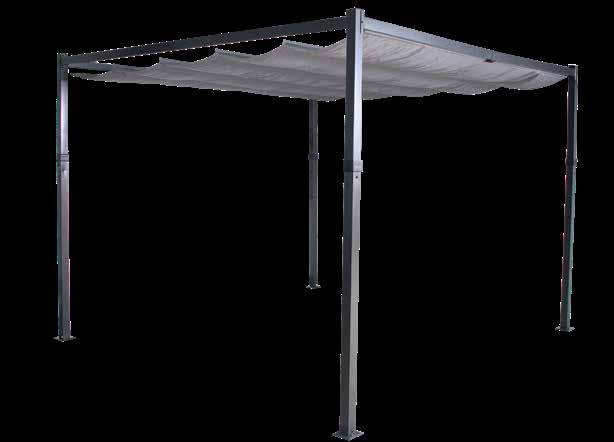L295 x B295 x H220cm • Gepoederlakt stalen frame • 250gr polyester met UV50+ • Antraciet • Het doek kan open worden geschoven