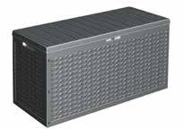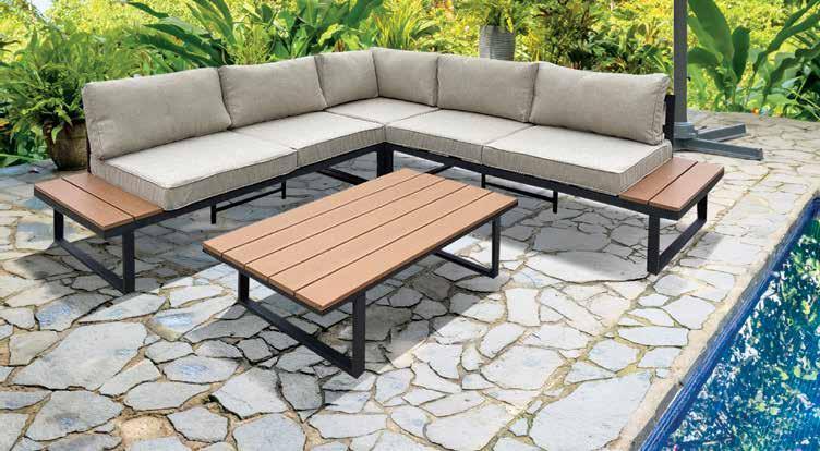 Aluminium frame, antraciet • 2-zits bank+ polywood tablet L154. x B73.5 x H62cm • Hoekbank L73.5 x B73.5 x H62cm • Tafel met polywood blad L110 x B30 x H62cm • Met kussens 10cm 220gr/m² donker grijs