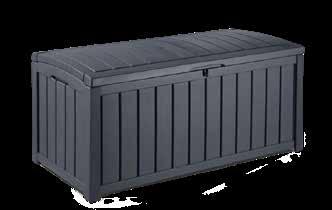 Het deksel opent eenvoudig, door middel van een gasveer • Aan de onderkant zijn aan 1 kant wieltjes bevestigd zodat de kussenbox gemakkelijk verplaatst kan worden • Aan de zijkanten zijn handvaten bevestigd • Arctic grey
