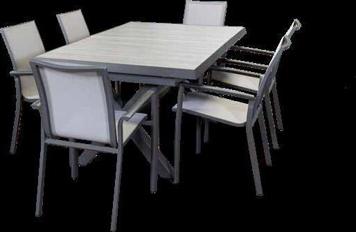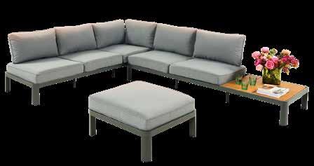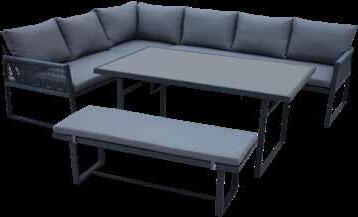 Aluminium frame, antraciet • 2x 3-zits- banken L222 x D74 x H26cm • Salontafel met polywood blad L71 x B71cm x H26cm • Met olefin kussens 200gr donker grijs • Tafelblad, kussens en rugleuningen zijn verwisselbaar
