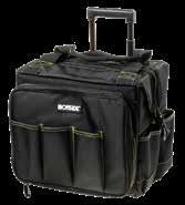 Gereedschapstas met wiel (trolley) met interne en externe zakken • 1 groot voorvak met ritssluiting met klittenband en zijvak met ritssluiting • Meerdere interne en externe zakken: 6 kleine zakken buiten, 9 verdeelde zakken binnenin • Verwijderbare gereedschapswand. - 394901/S